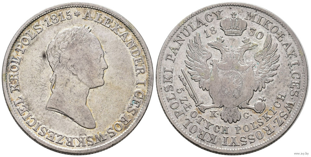 Великолепные по состоянию 5 злотых 1830 г K G Николай 1 варшавская чеканка 15.32 грамма патина каталог Копицкий 2709