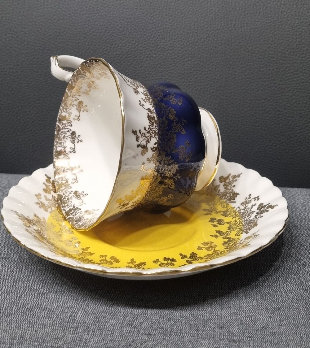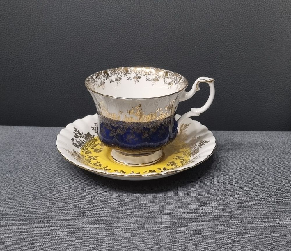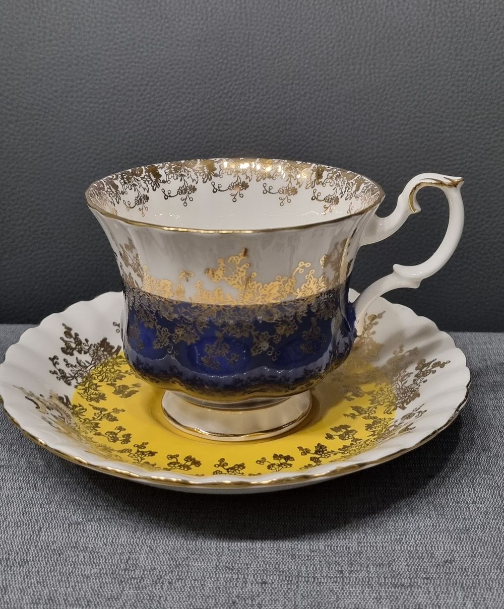 Винтажная чайная пара Royal Albert Regal Series из костяного фарфора, украшенная кобальтовым синим и золотым декором.