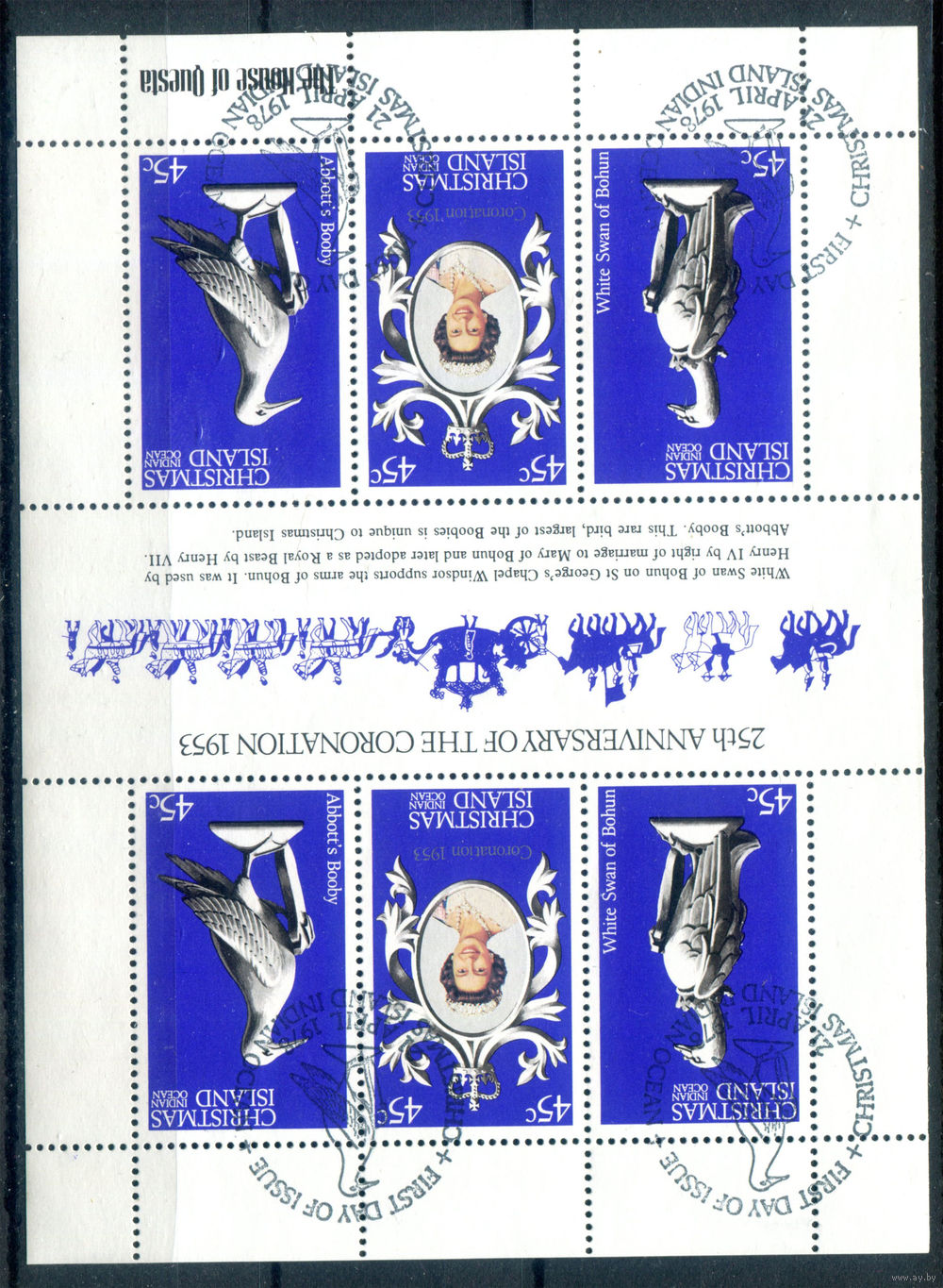 ![Рождественские острова - 1978г. - 25 лет коронации королевы Елизаветы II - 1 малый лист - полная серия, гашёный с клеем [Mi 98-100]. #3-WB-95-KS-5](https://s1-lot.aystatic.by/550x510/140/133/5040/5040133140_0.jpg)