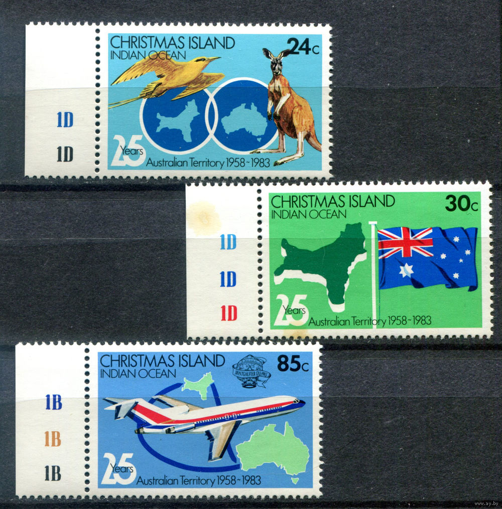 ![Рождественские острова (о-в Рождества) - 1983г. - 25-я годовщина присвоения острову Рождества статуса территории Австралии - 3 марки - полная серия, MNH, одна марка с пятнами на лицевой стороне [Mi 177-179]. #4-B6-Z-1-22](https://s5-lot.aystatic.by/550x510/19/726/5040/5040726019_0.jpg)