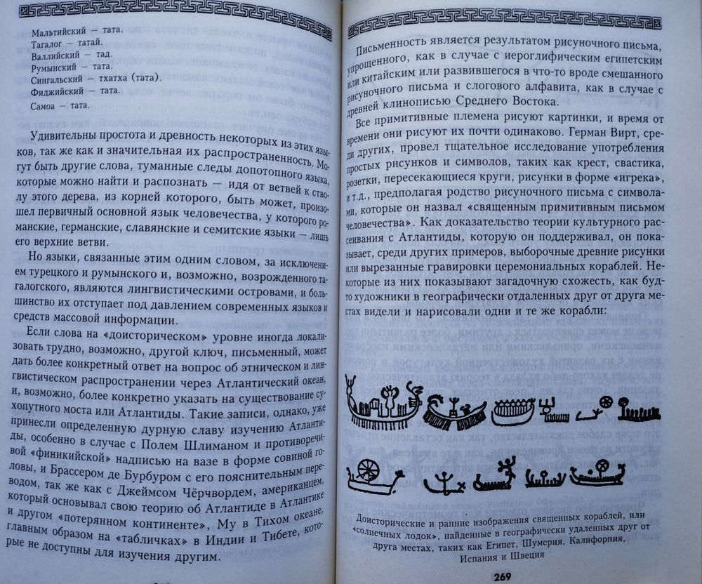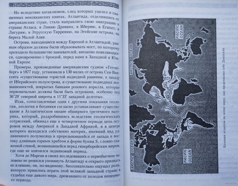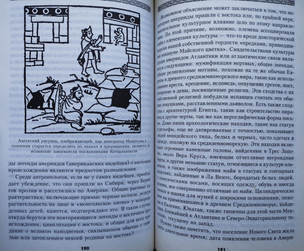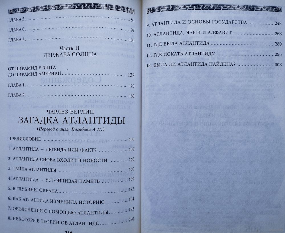 Большой формат. Тираж 5000 экз. 320 стр. В очередной книге серии "Атлантида" опубликованы работы двух европейских атлантологов, Роже Дэвиня "Атлантида" и Чарльза Берлица "Загадка Атлантиды", первая из которых издавалась лишь один раз крохотным тиражом, вторая же переведена на русский язык впервые. Если Дэвинь, опираясь на многочисленные исследования, красочно и убедительно, с присущим ему романтизмом, реконструирует облик и быт атлантов, периоды зарождения, расцвета и угасания их империи, то Берлиц скрупулезно, но увлекательно повествует об археологических находках на дне Атлантического океана в разных его частях, свидетельствующих в пользу существования Атлантиды, а также проводит сравнительный анализ, в том числе в области языка и письменности, между древними цивилизациями ацтеков и майя и цивилизациями Евразии.