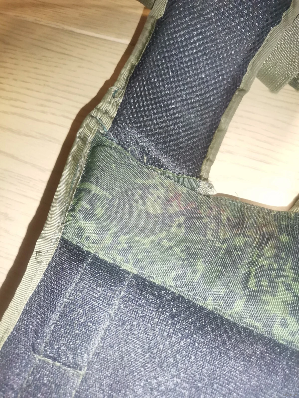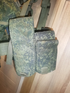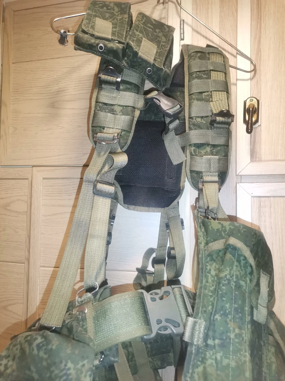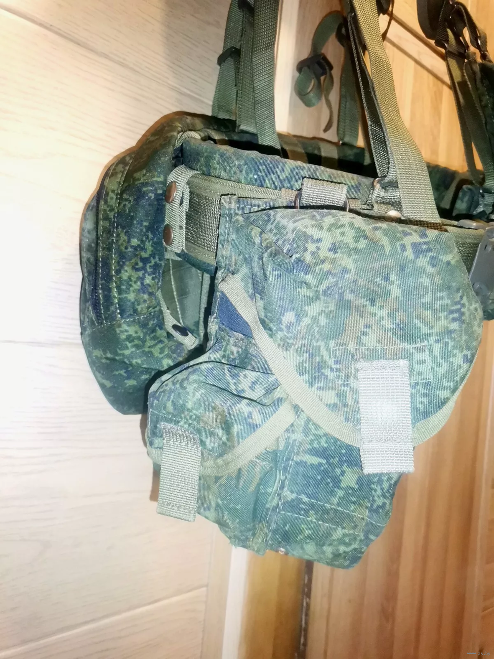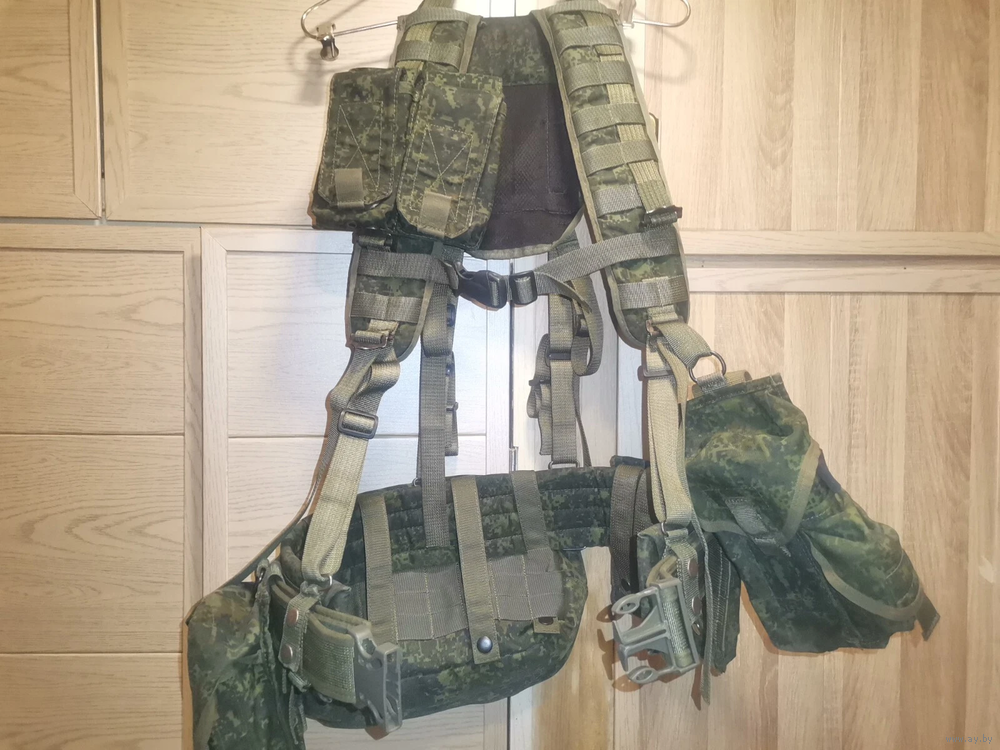 Липучка MOLLY и пластиковый карабин. 1 подсумок на 2 магазина с патронами для автомата АК-74, на плече и на поясе. 2 подсумка, один на липучке, на поясе. 1 откидной карман на 2 снайперских магазина + пара карманов для гранат, на шнурке груди + 1 такой же на поясе. Все подсумки можно распределить по своему усмотрению. Много шнуров для крепления вещей. Крепления для сброса рюкзака на спине.