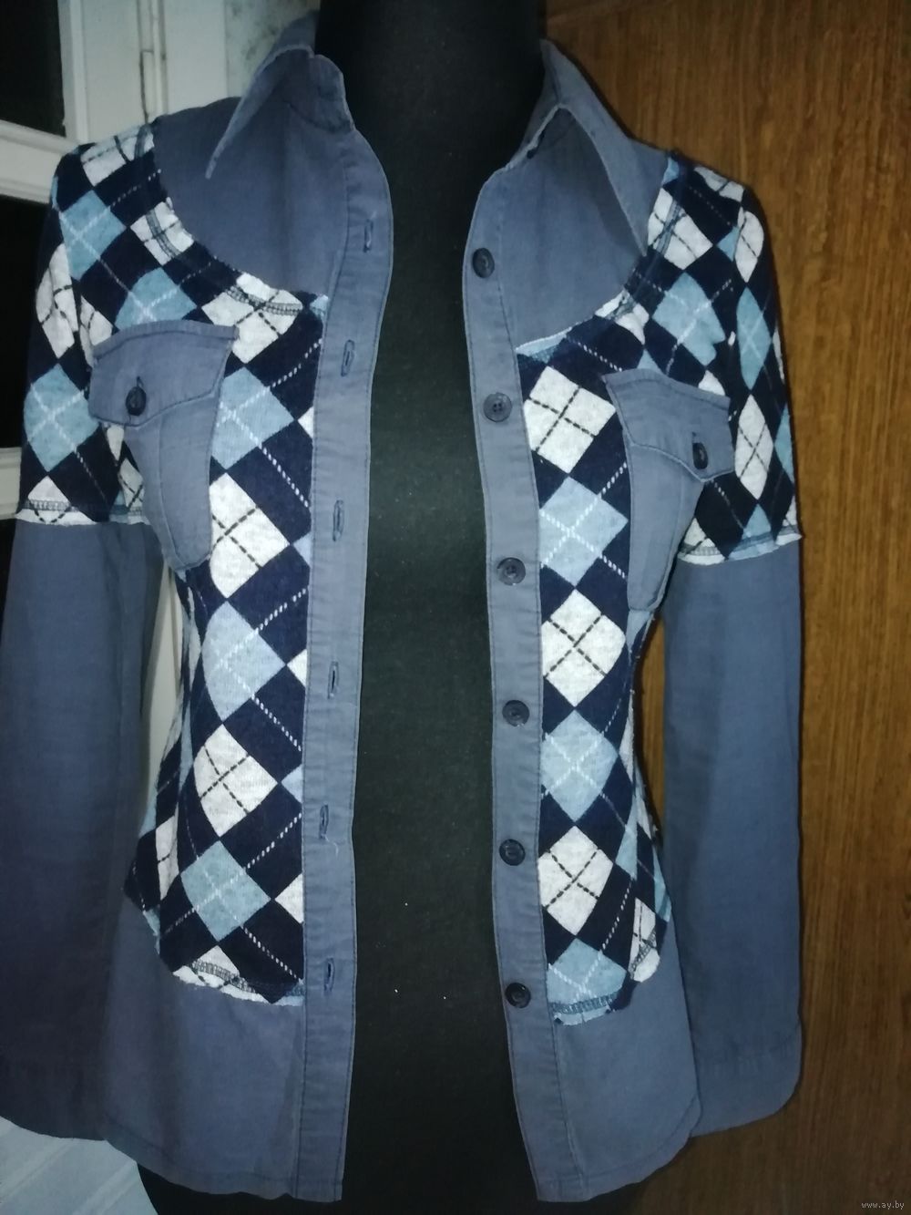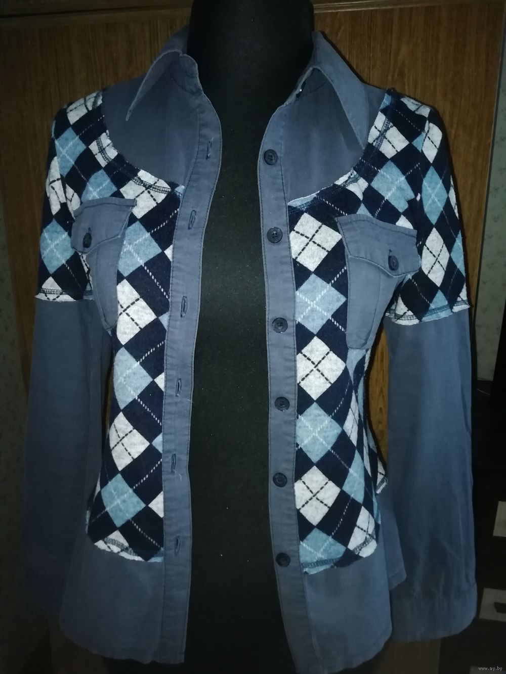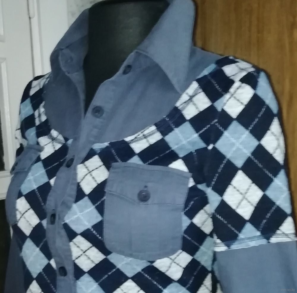 | Рубашечка очень приятная к телу, мягкая,приглушенный синий цвет оригинальная. Размер может42, то будет более свободна.Длинна спинки от плеча62см, рукав61см. Одета на маникен46 размера. | |