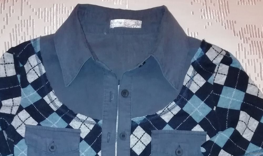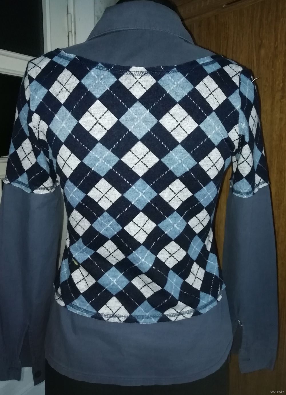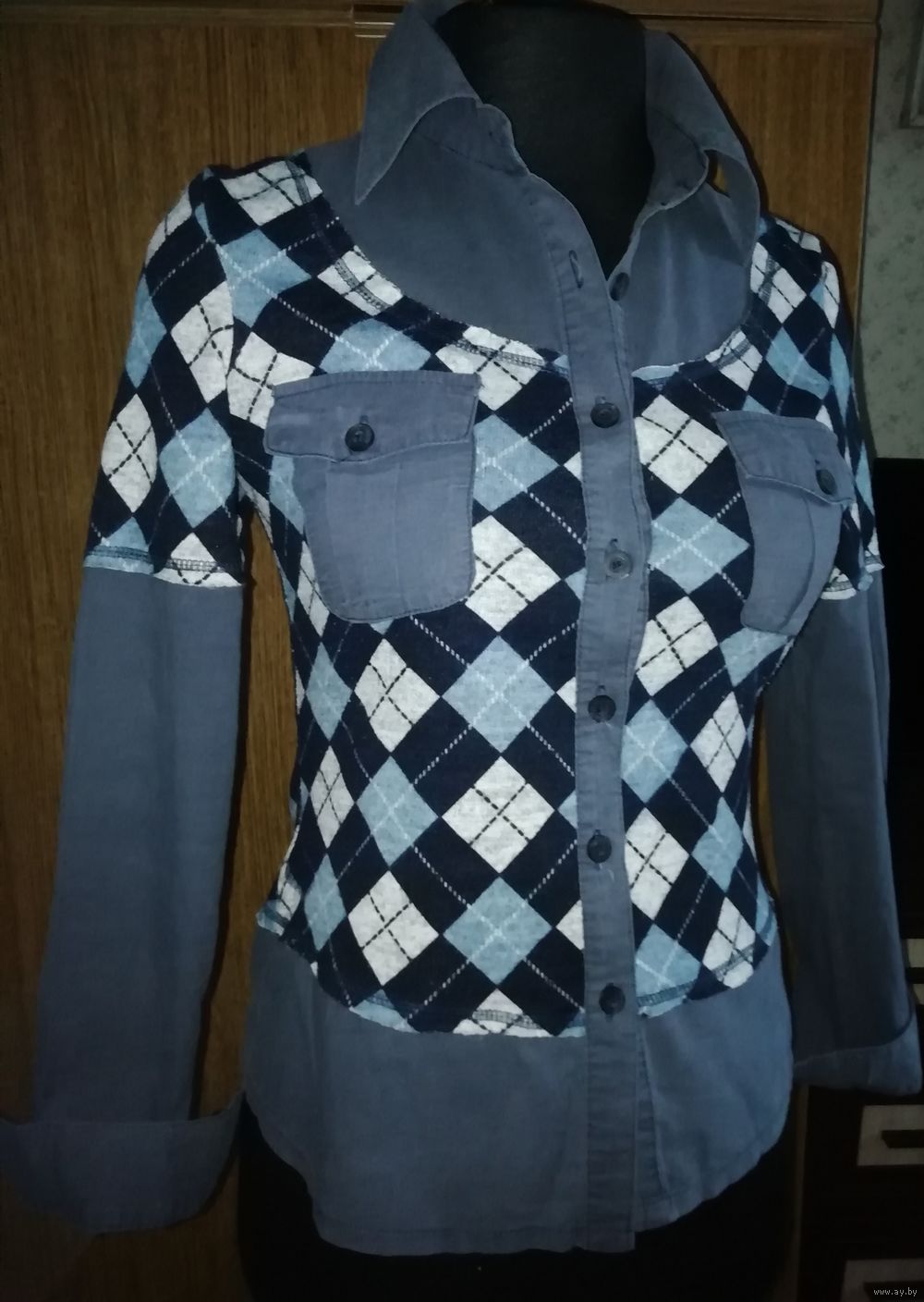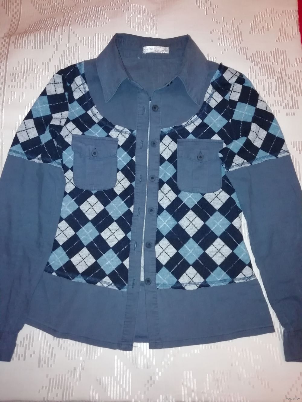 | Рубашечка очень приятная к телу, мягкая,приглушенный синий цвет оригинальная. Размер может42, то будет более свободна.Длинна спинки от плеча62см, рукав61см. Одета на маникен46 размера. | |