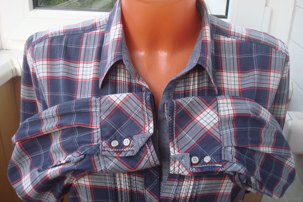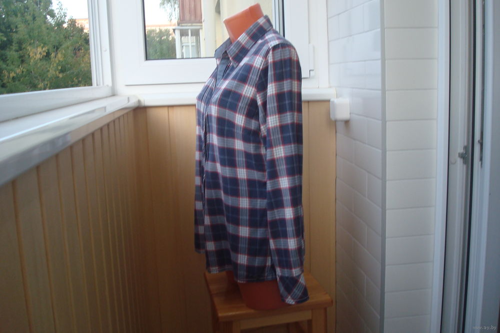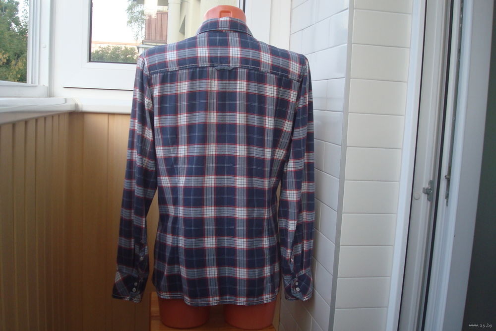 Рубашка на симпатичных кнопках, стилизованных под пуговицы. Причем, очень интересно расположены кнопки на манжетах (смотри фото). Сам уголок манжета подвёрнут и красиво застрочен. Внизу на полочке пришит металлический прямоугольник с указанием бренда.