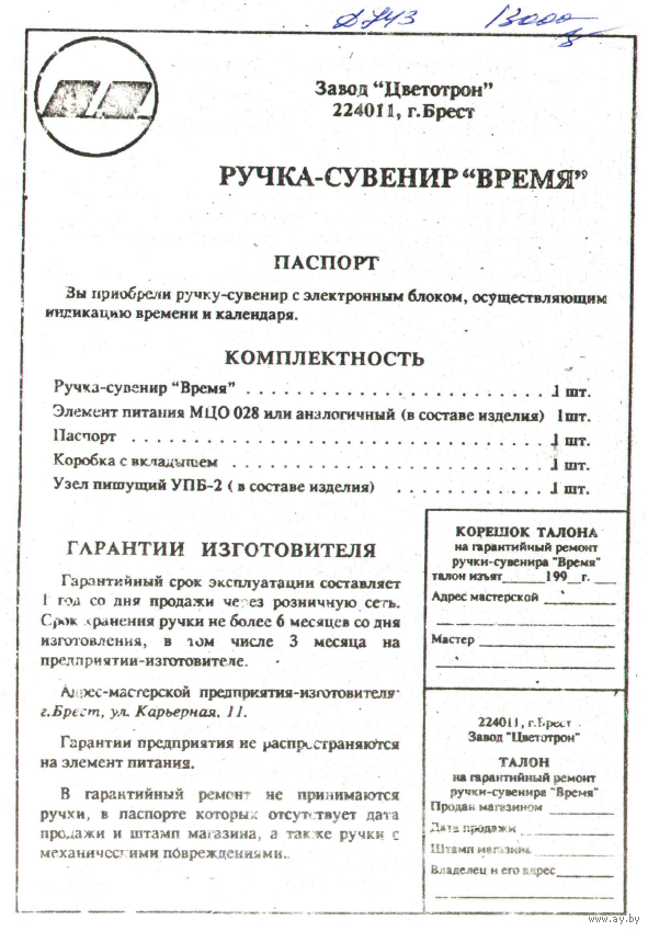 Производились на оборонном предприятии электронной промышленности - завод Цветотрон (с тех времён и до сих пор входит в НПО "Интеграл"). Проходили контроль качества по правилам военной приёмки (см. штамп ОТК в паспорте). Судя по надписи в паспорте - эта ручка изготовлена в феврале 1996 г.