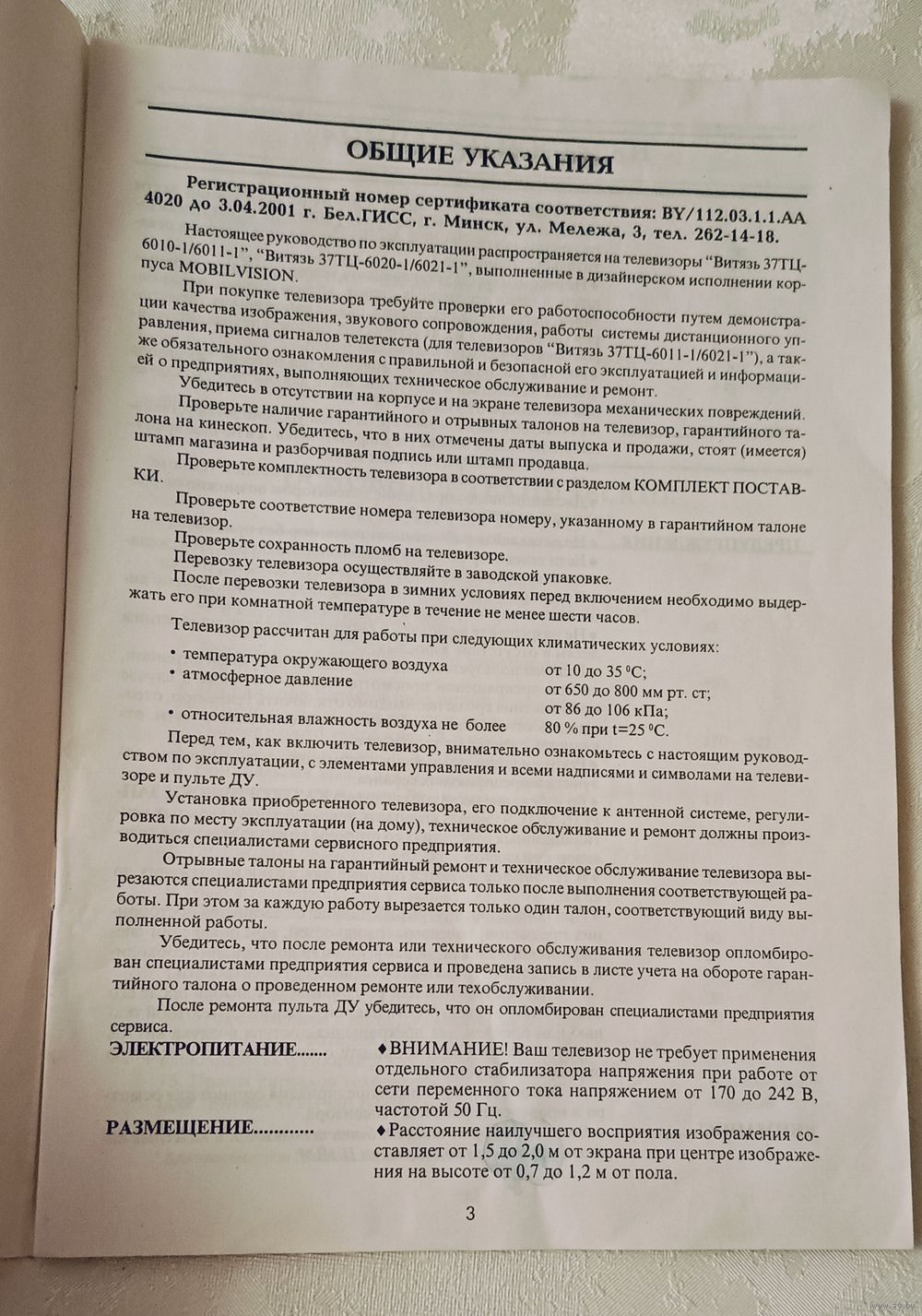 Руководство по эксплуатации для цветных телевизоров Витязь серий 37ТЦ-6010-1/6011-1 и 37ТЦ-6020-1/6021-1.