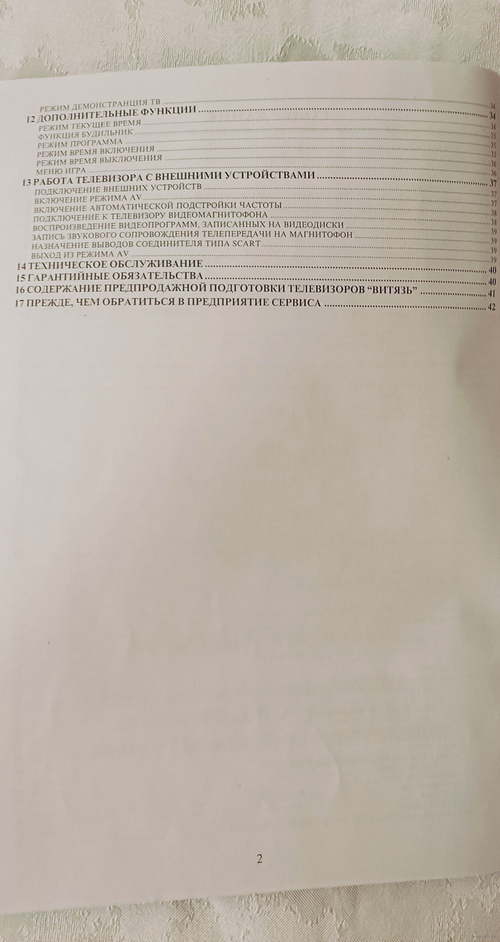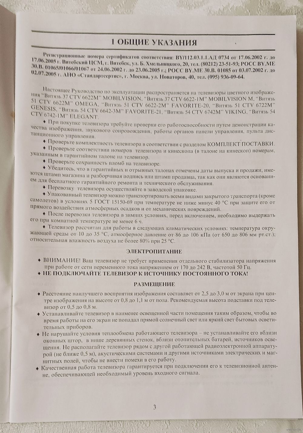 Руководство по эксплуатации. Телевизор Витязь (54 CTV 6642-3M 6742M/6742-1M 51 CTV 6622M 6622-2M/6722M 37 CTV 6622M/6622-1M)