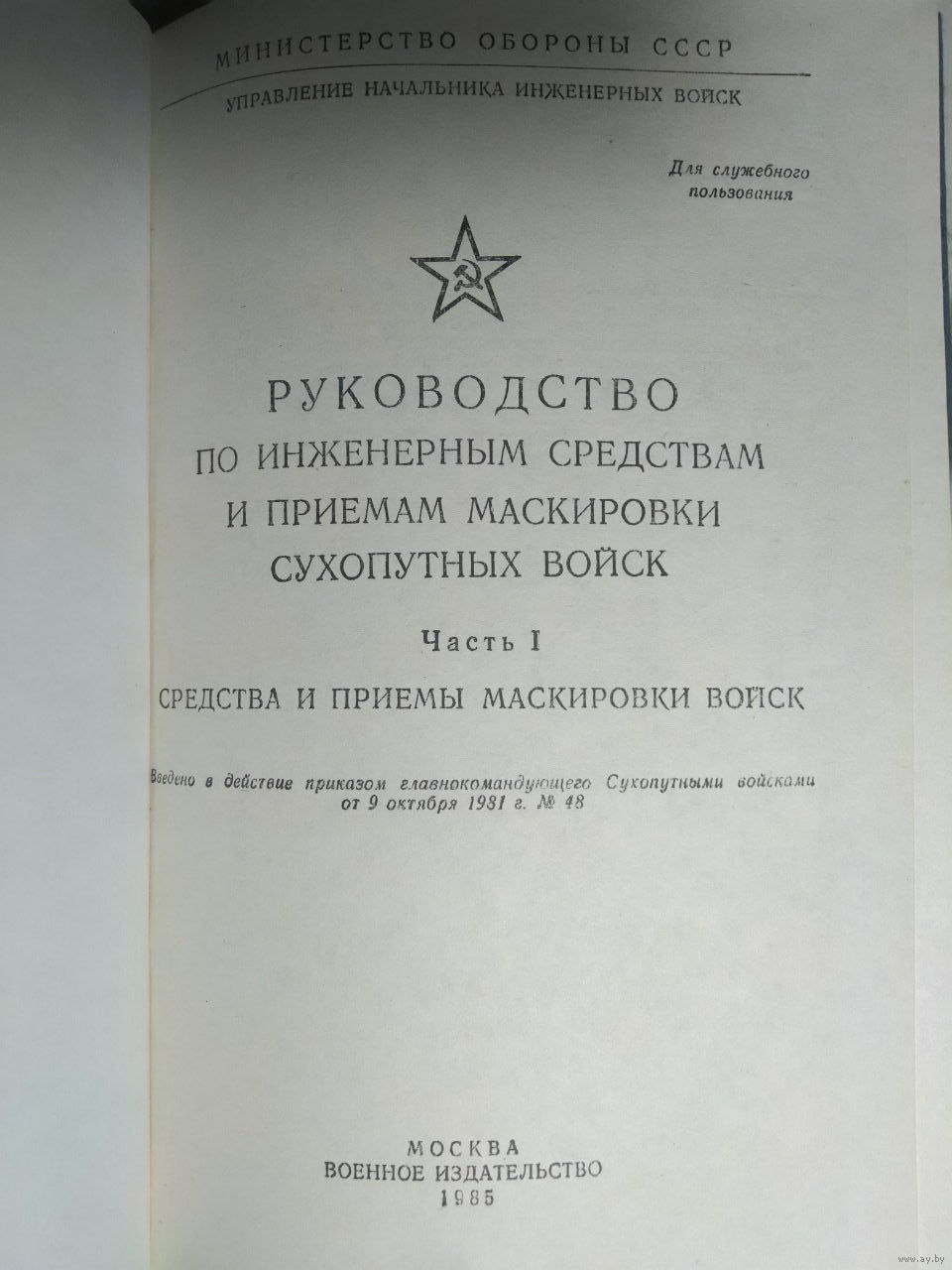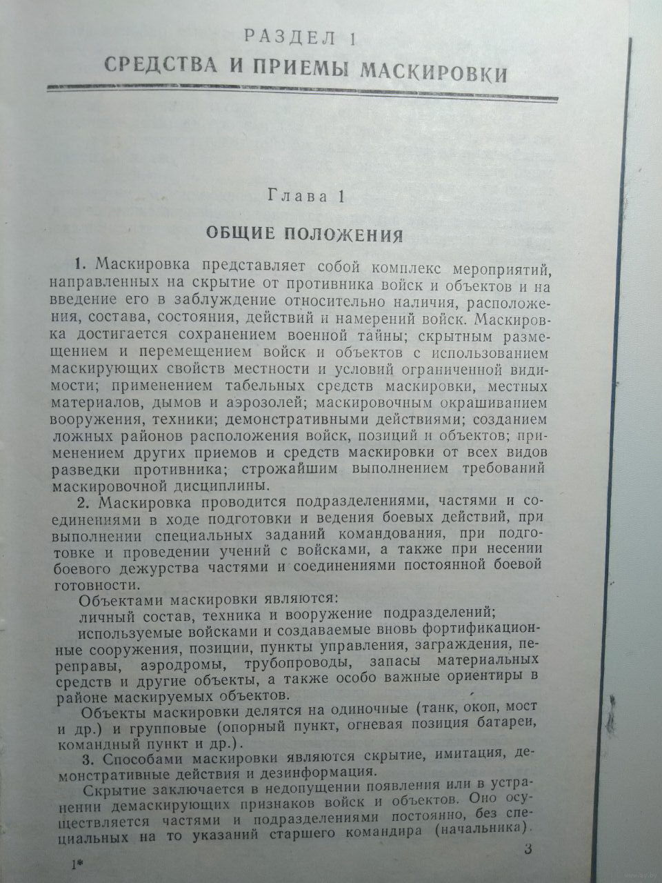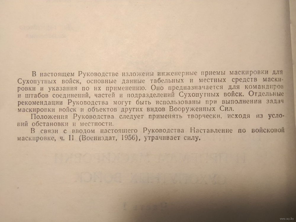 В настоящем Руководстве изложены инженерные приемы маскировки для Сухопутных войск, основные данные табельных и местных средств маскировки и указания по их применению. Оно предназначается для командиров и штабов соединений, частей и подразделений Сухопутных войск. Отдельные рекомендации Руководства могут быть использованы при выполнении задач маскировки войск и объектов других видов Вооруженных Сил.