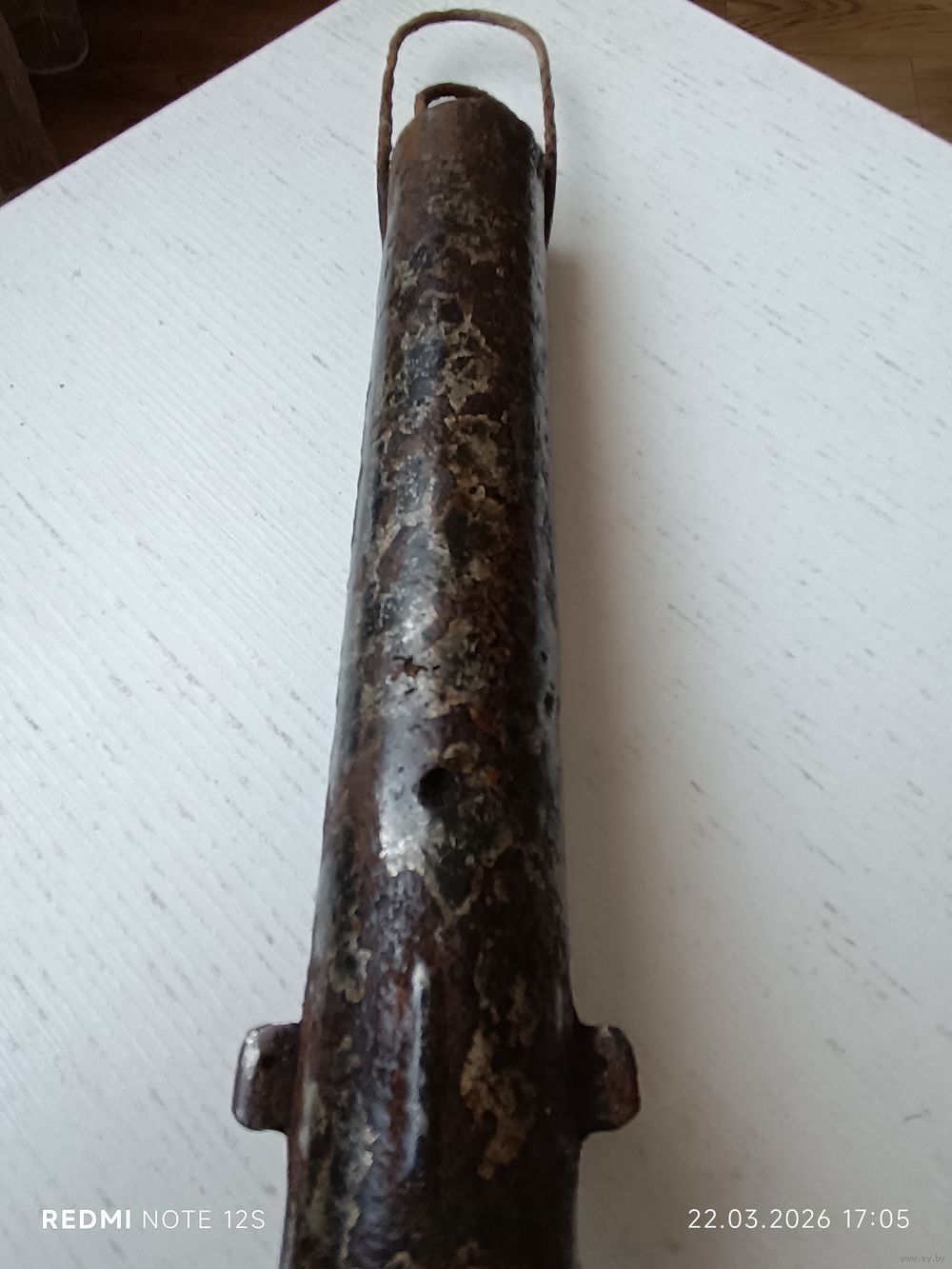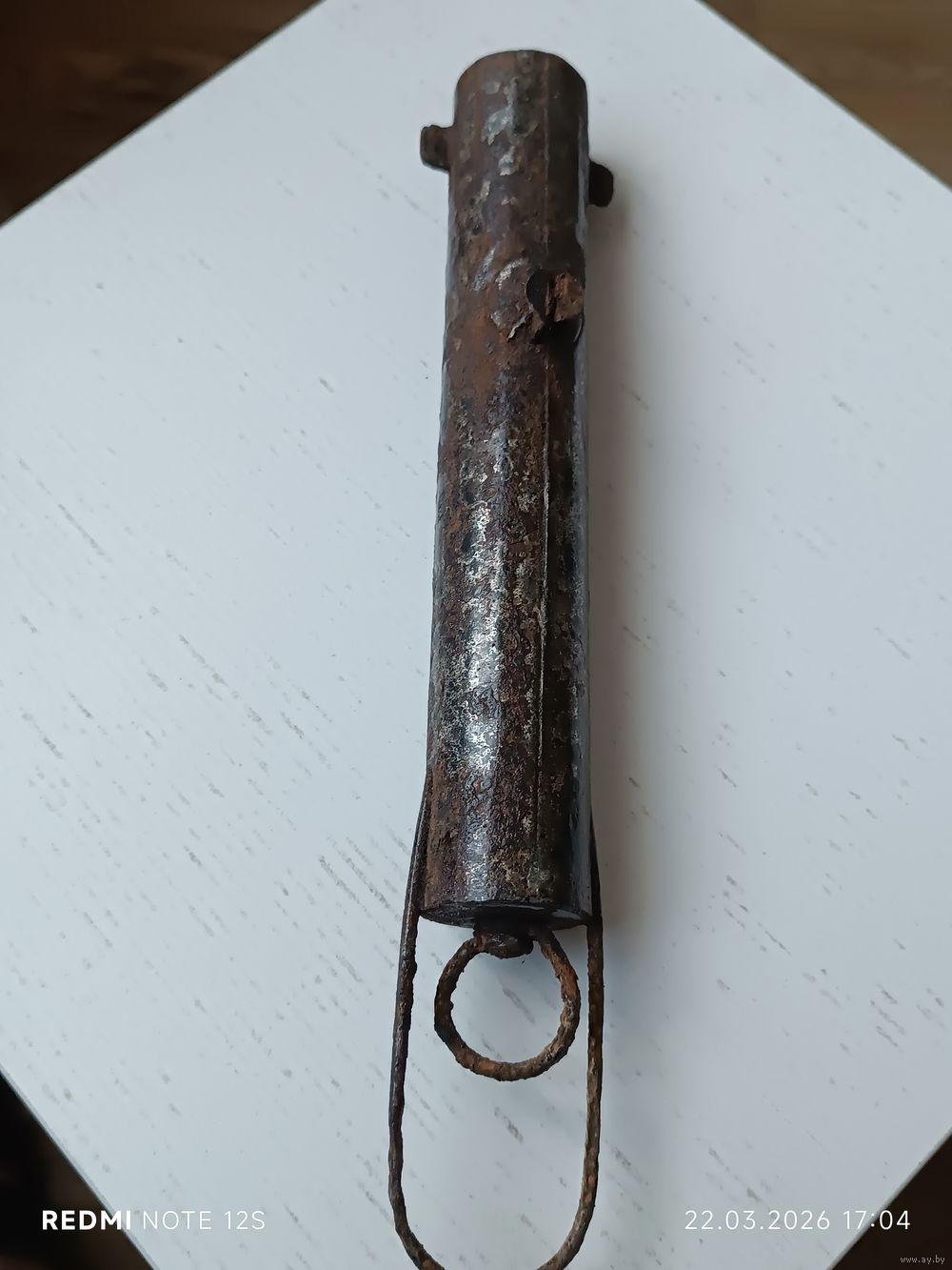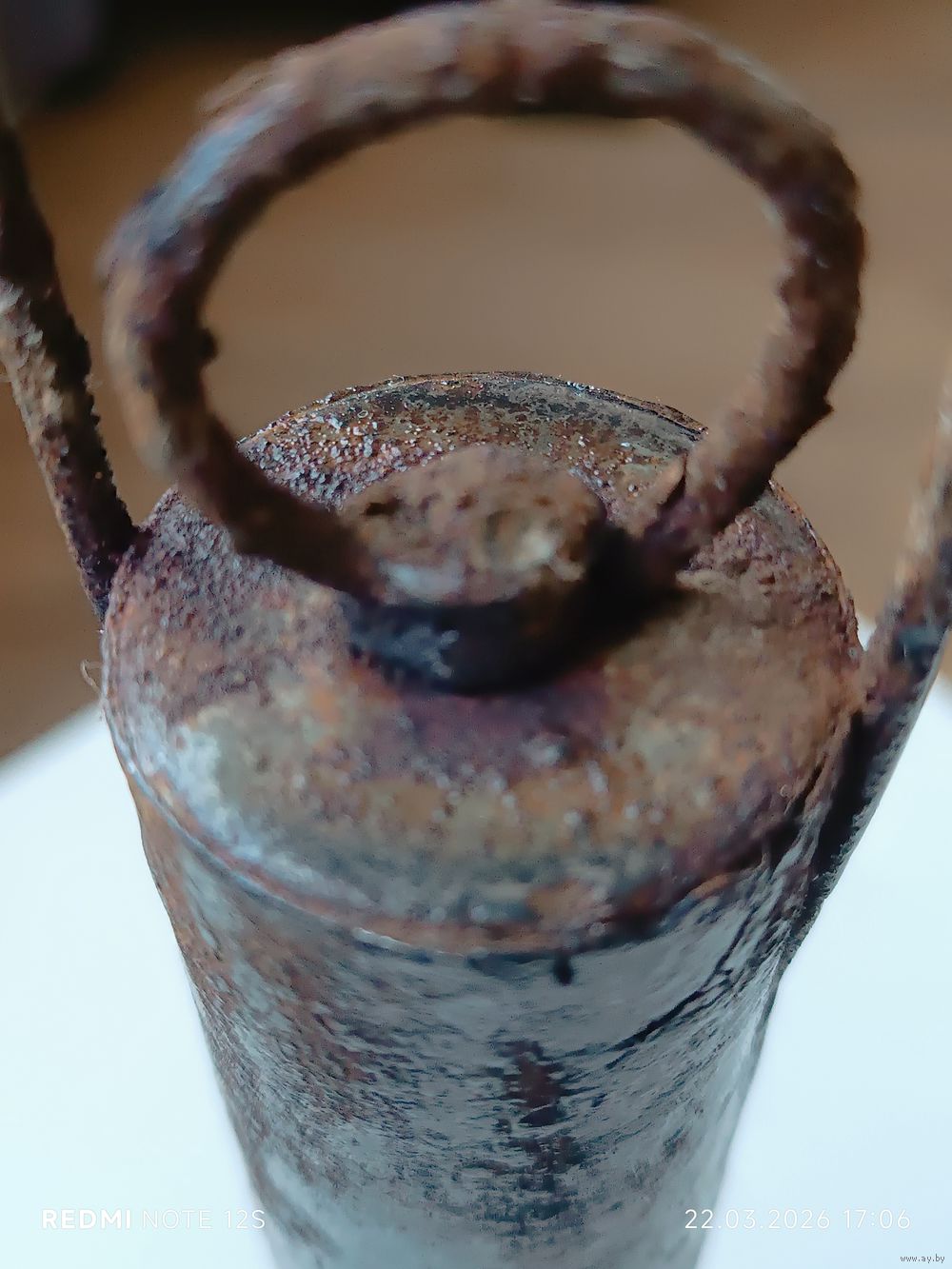 Комплектность: Сохранилось оригинальное проволочное кольцо для переноски (редкая деталь для таких находок). Геометрия «ушек» и корпуса не нарушена.