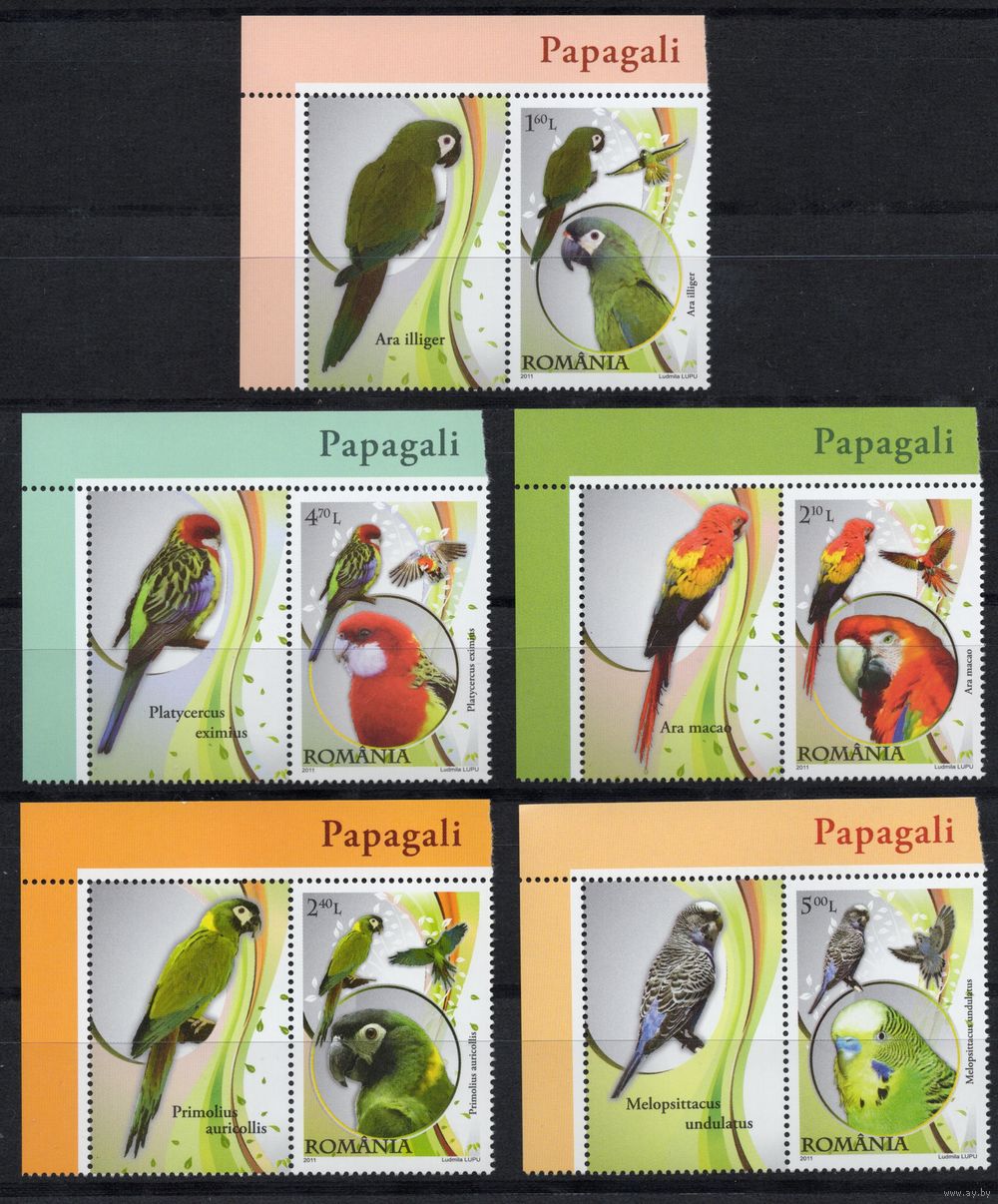 Румыния 2011. Фауна. Попугаи. 5 марок+купон 6499к