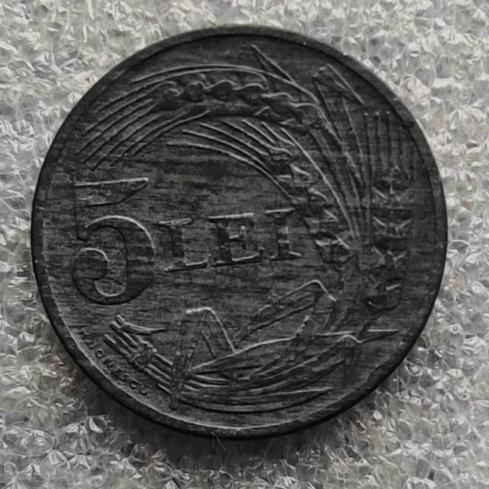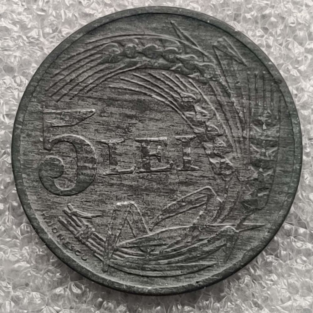 Номер KM # 61 Страна Румыния Период Королевство Румыния (1930 - 1947) Правитель Михай I Валюта Румынский лей Вид чекана Регулярный чекан Номинал 5 леев Год 1942 Гурт Гладкий Форма Круг Отношение авс/рев Монетное (180°) Материал Цинк Вес (g) 4,5 Диаметр (mm) 23 Толщина (mm) 1,75