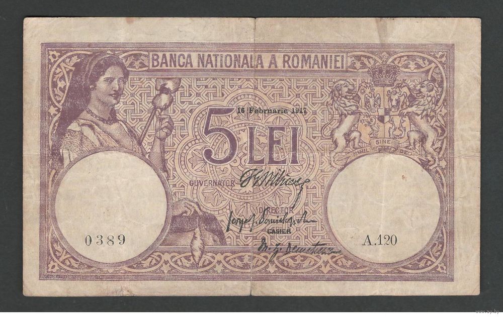 Румыния 5 лей 1917 года. Дата 16 февраля. Тип Р-24. Состояние VF-