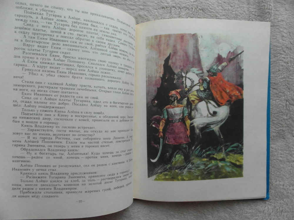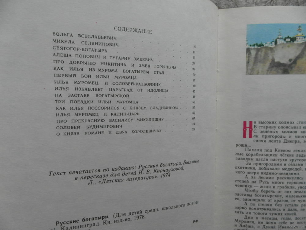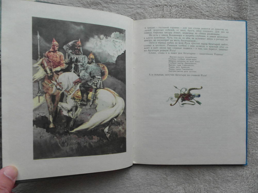 Великолепные цветные полностраничные иллюстрации. Плотная бумага. Текст печатается по одноименному изданию Л. Детская литература, 1974 г. С о д е р ж а н и е. Вольга Всеславьевич. Микула Селянинович. Святогор-богатырь. Алеша Попович и Тугарин Змеевич. Про Добрыню Никитича и Змея Горыныча. Как Илья из Мурома богатырем стал. Первый бой Ильи Муромца. Илья Муромец и Соловей-разбойник. Как Илья от Святогора мечь получил. Илья избавляет Царьград от Идолища. На заставе богатырской. Три поездки Ильи Муромца. Как Илья поссорился с князем Владимиром. Илья Муромец и Калин-царь. Про прекрасную Василису Микулишну. Соловей Будимирович. О князе Романе и двух королевичах.