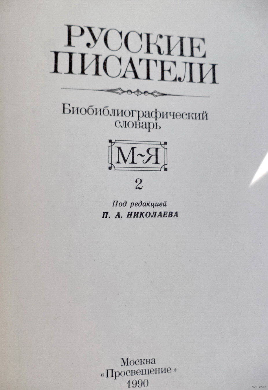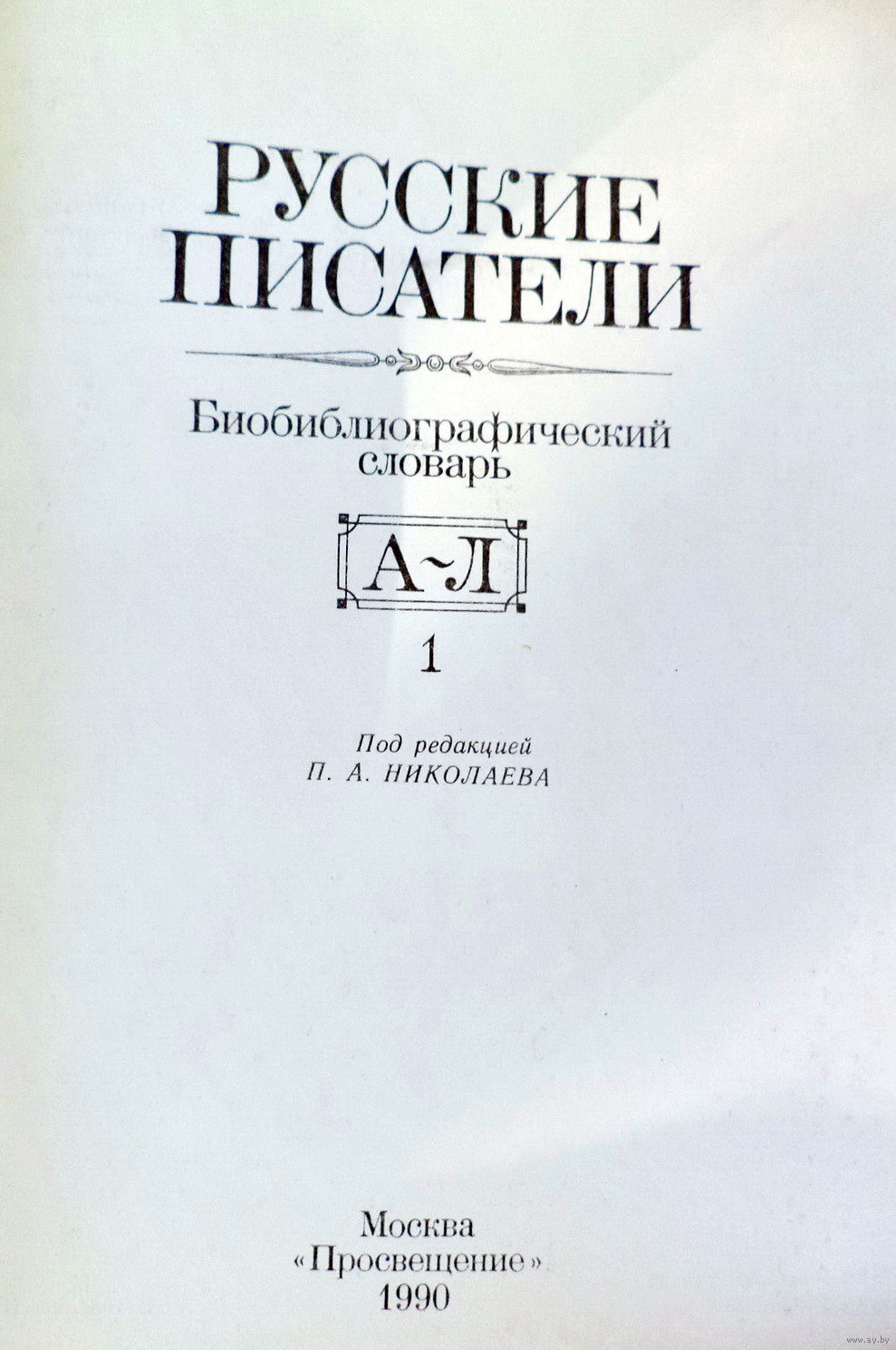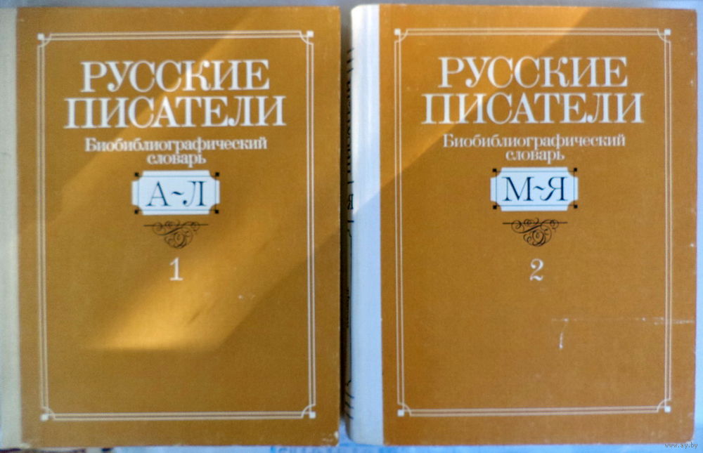 Русские писатели. Биобиблиографический словарь А-Л (1том-430стр), М-Я (2том-446стр),под ред.П.А.Николаева, тираж 350.000экз, Москва, Просвещение, 1990г, твердый переплет. Включают более 300 статей о жизни и творчестве рус.писателей и литерат.критиков 19-нач.20 века (до 1917г), биография, характеристика творчества.