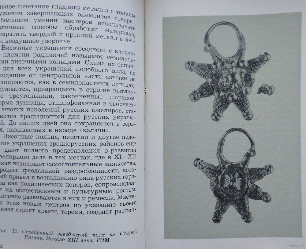 Тираж 16500 экз. 168 стр. Автор рассказывает о русском ювелирном искусстве, останавливаясь на важнейших этапах его развития. Интересно представлено описание украшений русского костюма и влияние современной моды на развитие ювелирного дела. Работа иллюстрирована фотографиями ювелирных украше-ний, хранящихся в государственных художественных музеях. В книге 57 иллюстраций.