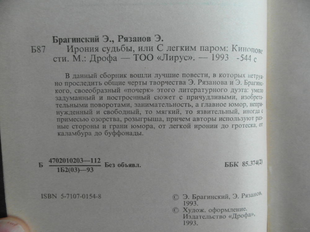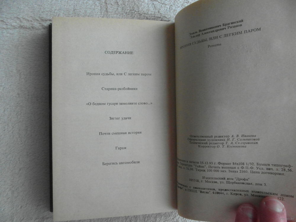 В книгу вошли известные киноповести: `Ирония судьбы, или С легким паром`, `Старики-разбойники`, `О бедном гусаре замолвите слово…`, `Зигзаг удачи`, `Почти смешная история`, `Гараж` и `Берегись автомобиля`.