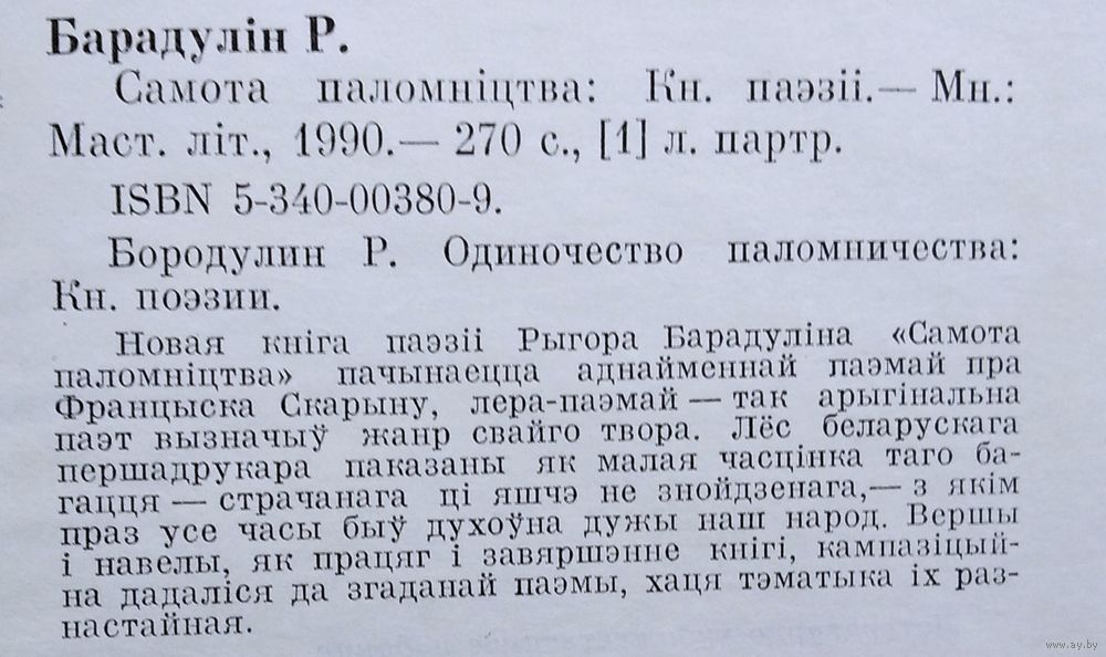Рыгор Барадулін. Самота паломніцтва: кніга паэзіі. Мінск. Мастацкая літаратура. 1990 г. 270 с. Цверды пераплет. Кішэнны фармат.