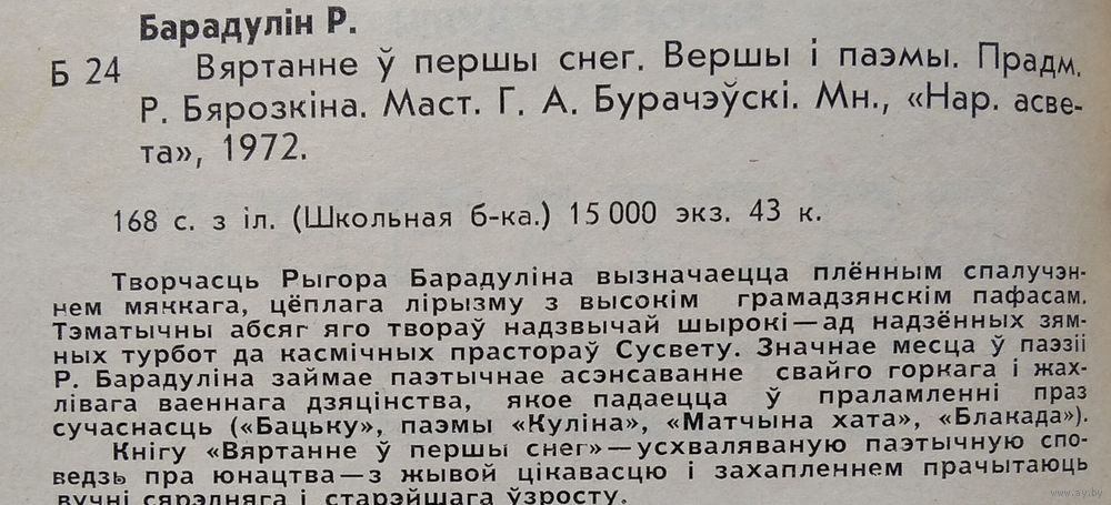 Рыгор Барадулін. Вяртанне ў першы снег: вершы і паэмы. (Школьная бібліятэка). Мінск : Народная асвета, 1972 г. 166 с. Цверды пераплет.