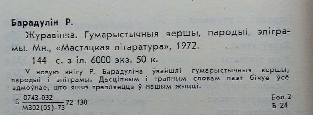 Рыгор Барадулін. Журавінка: гумарыстычныя вершы, пародыі, эпіграмы. Мінск : Мастацкая літаратура, 1973 г. 142 с. Мяккая вокладка.