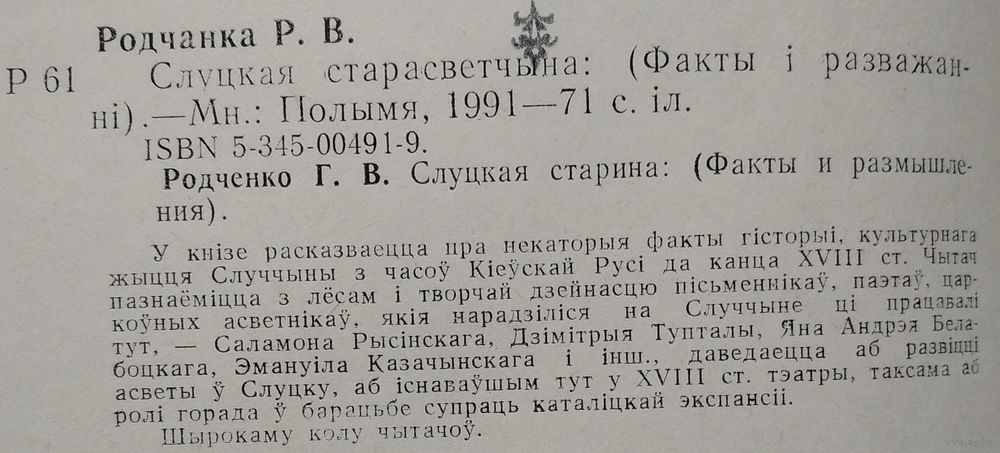 Рыгор Родчанка. Слуцкая старасветчына: факты і разважанні. Мінск : Полымя, 1991 г. 69 с. Мяккая вокладка.