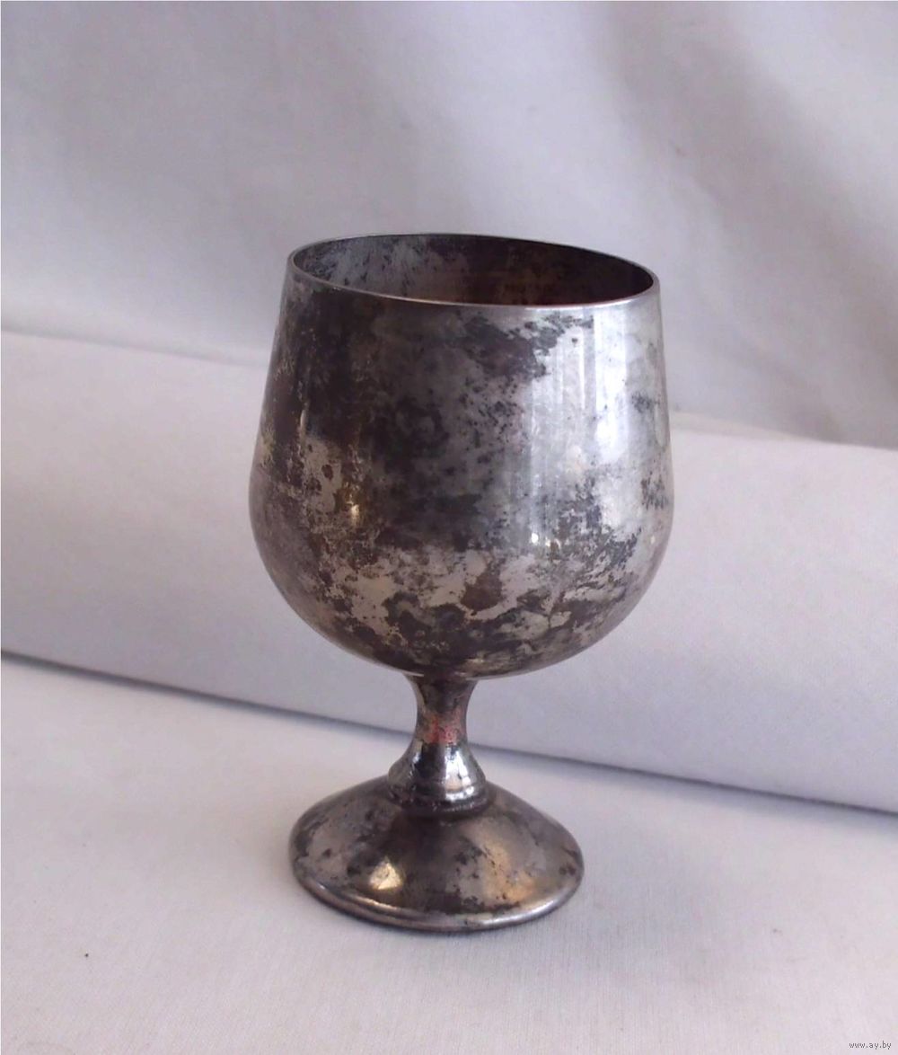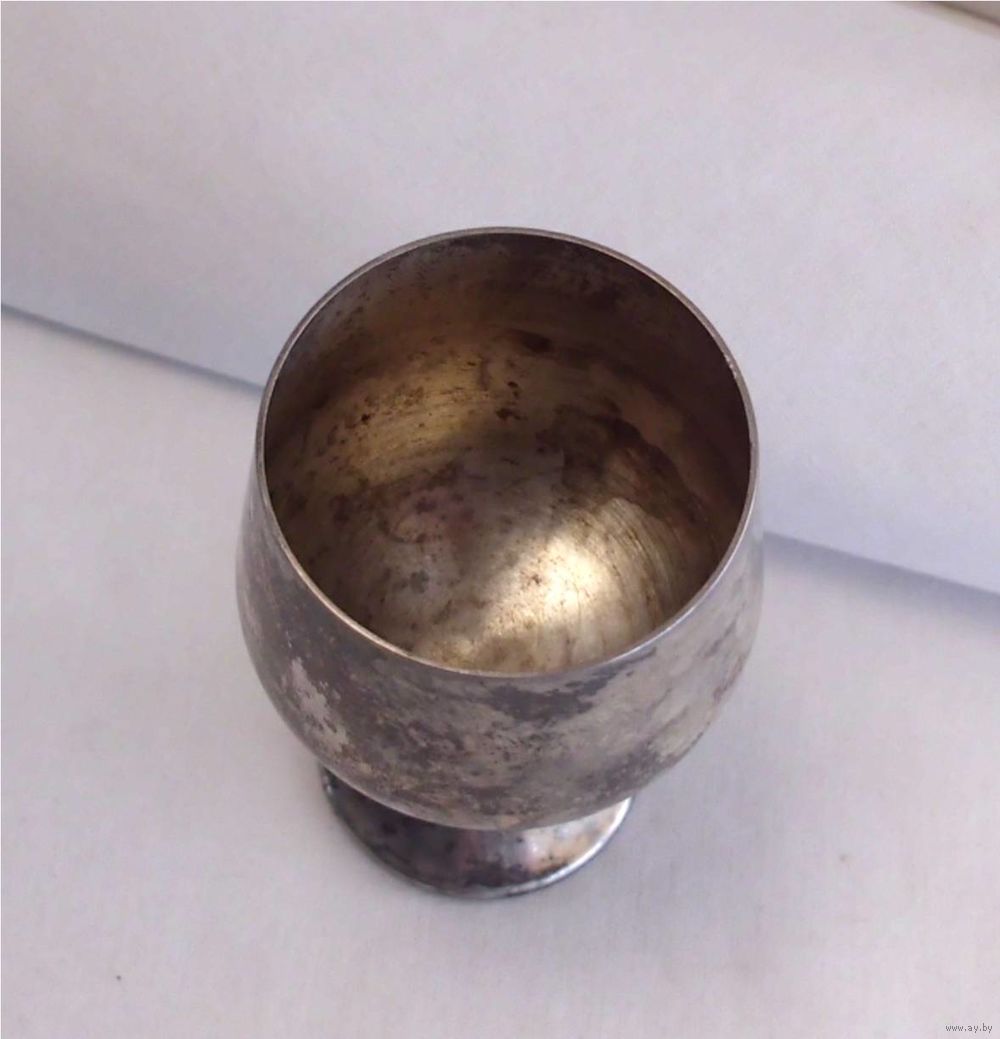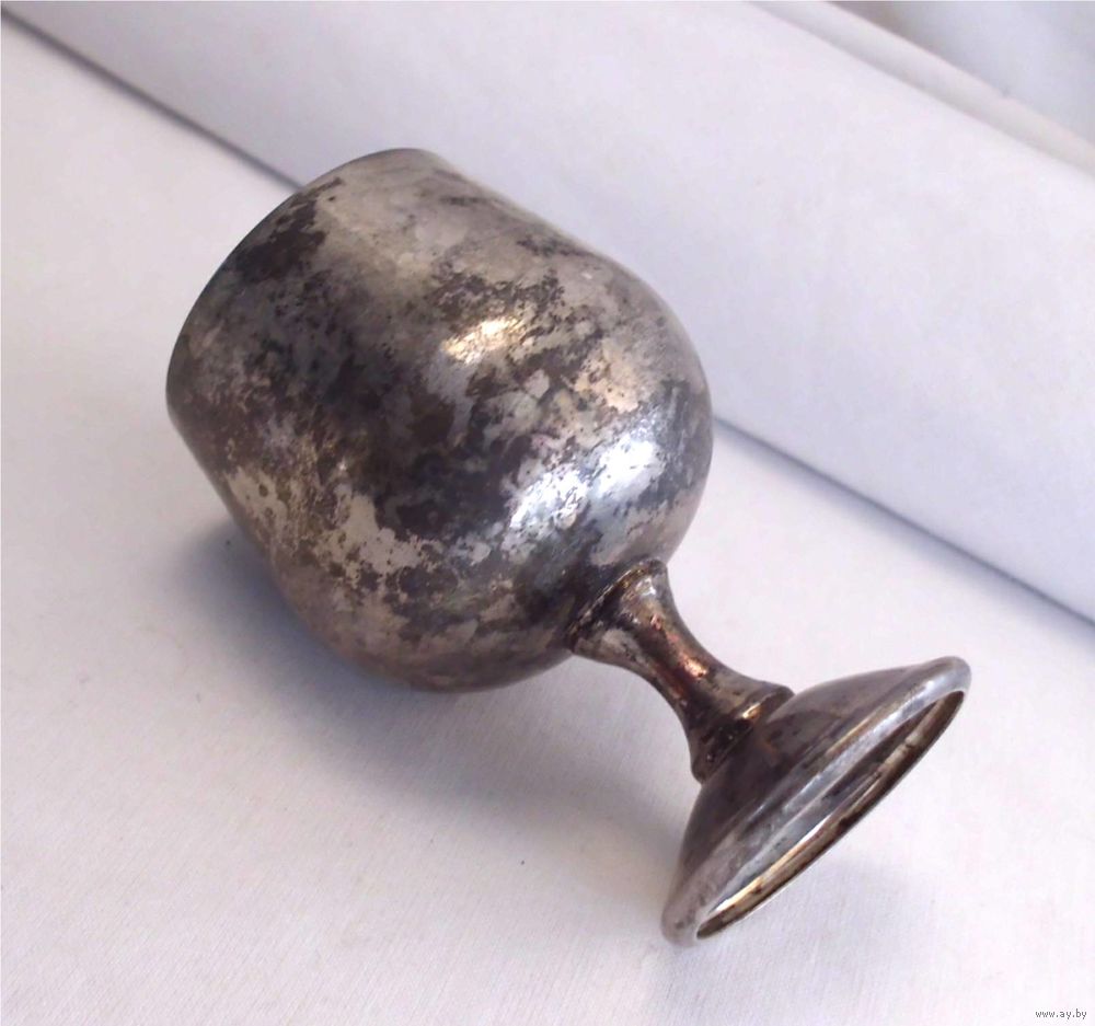 | На ножке рюмки есть сходы серебрения. Под серебрением металл похожий на медь. Ножка чуть согнута. | |
