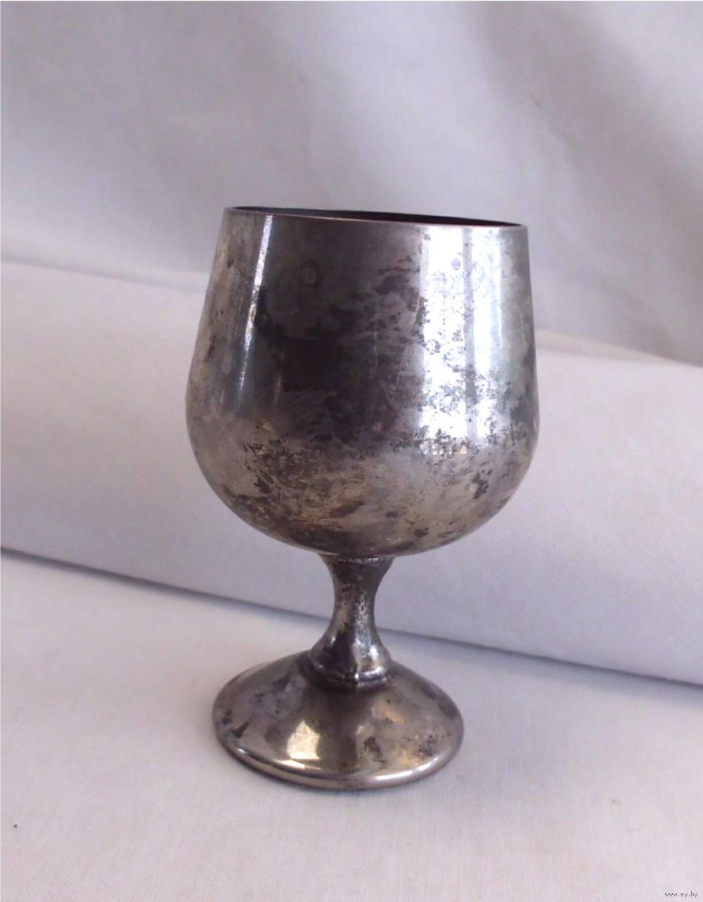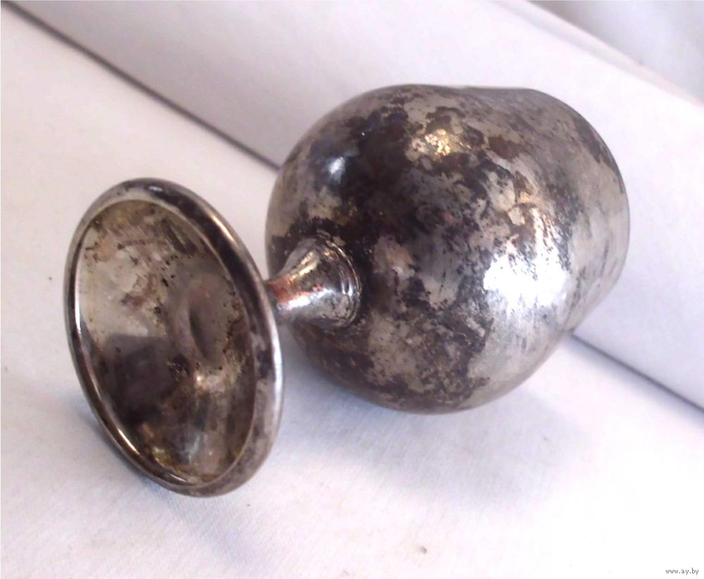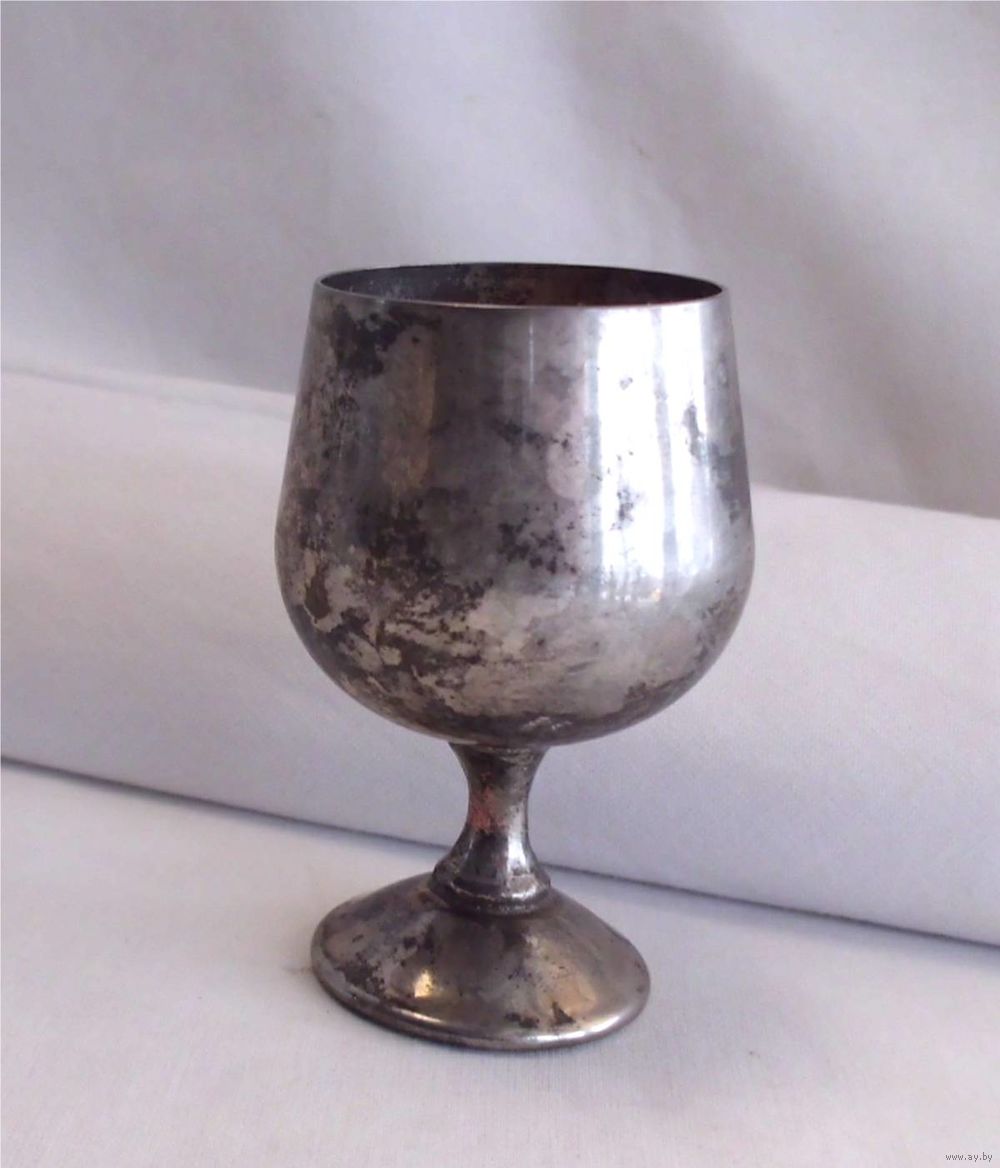 | На ножке рюмки есть сходы серебрения. Под серебрением металл похожий на медь. Ножка чуть согнута. | |