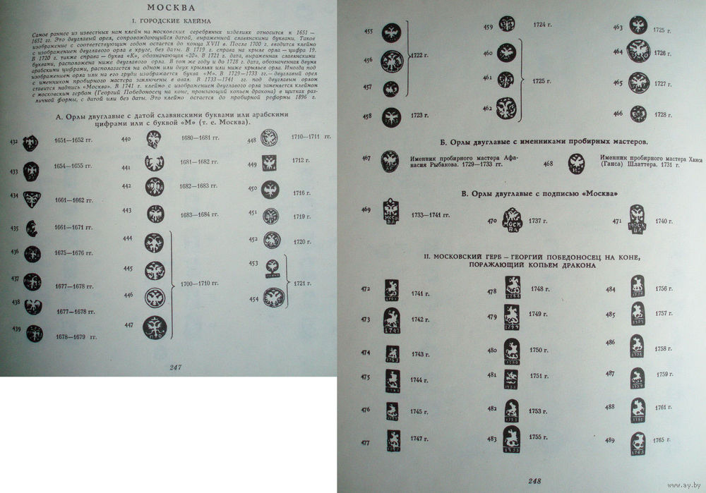 Четвёртое. Клеймо Москва (двуглавый орёл в круге, повернут хвостом на 2 циферблата часов) периода 1700-1710-х годов (книга Постникова-Лосева. Москва, 1974, стр. 247).