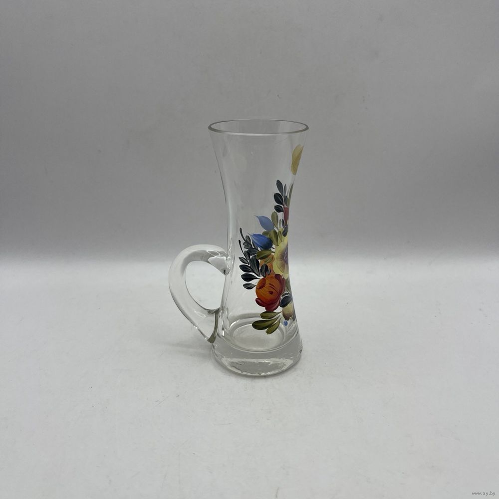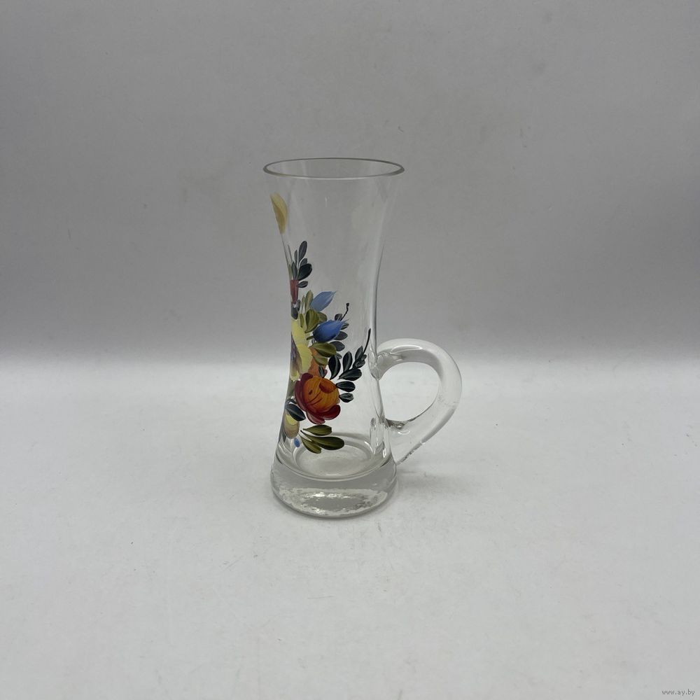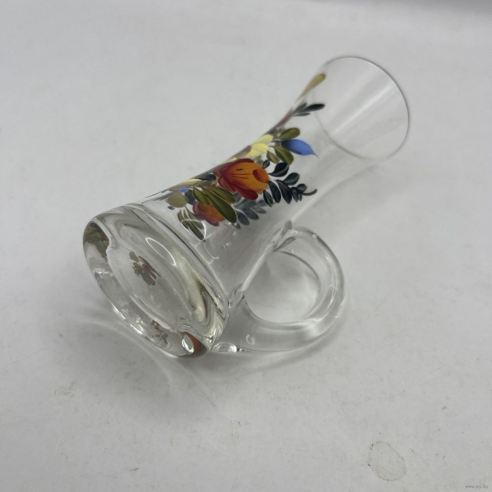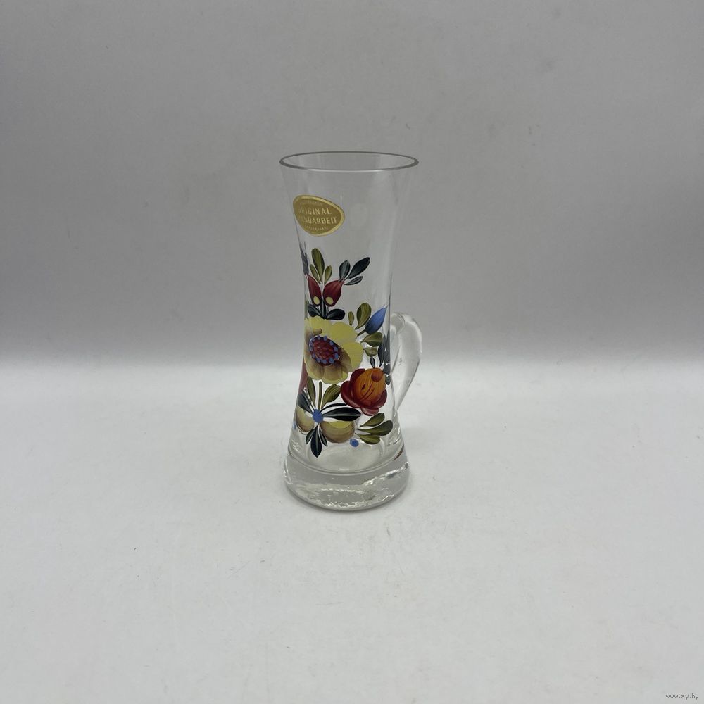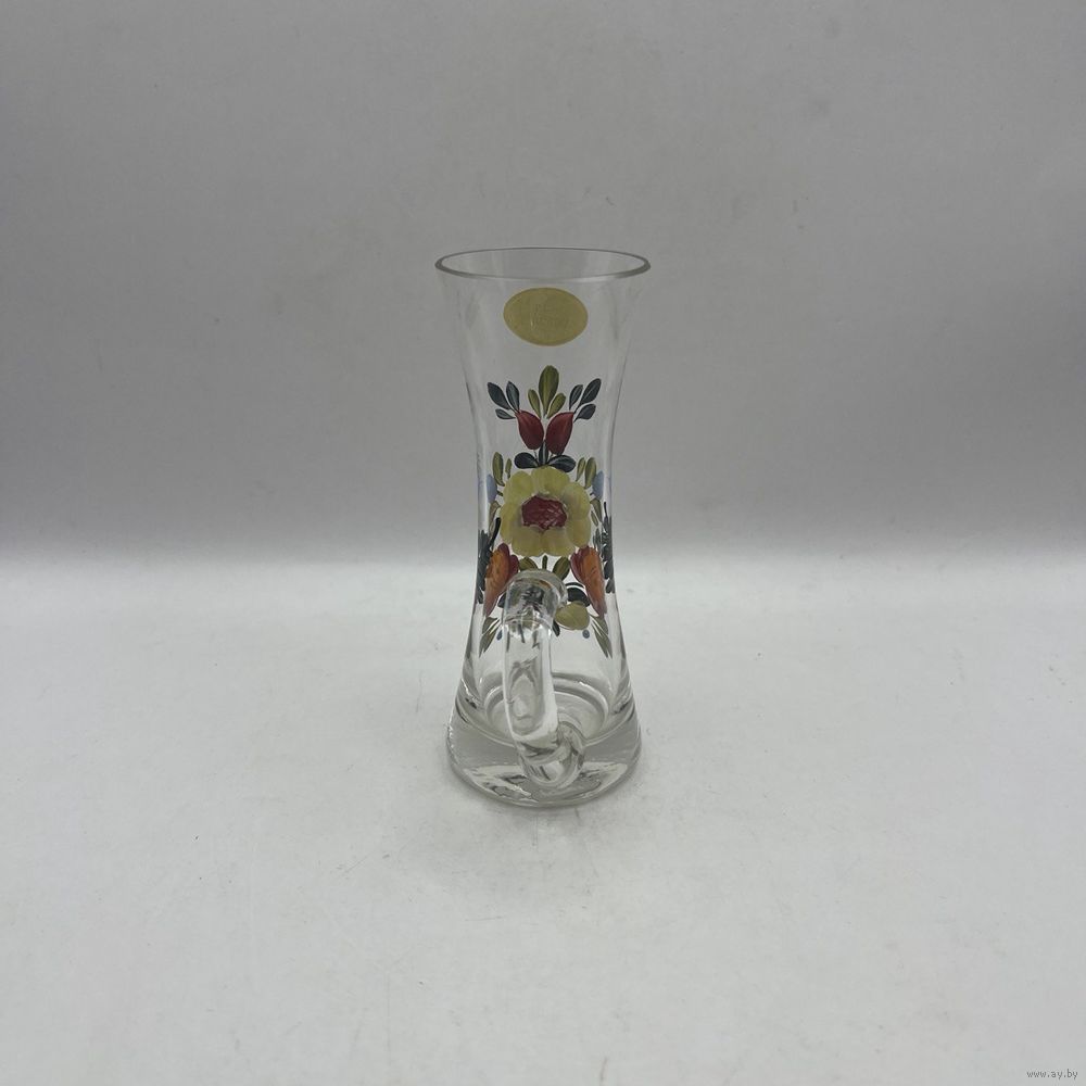 Винтажная стеклянная рюмка ручной работы из выдувного стекла с цветами ручной росписи. Австрия. 1980-е г.г. Стикер-сертификат. Объем 50 мл, высота 11 см.