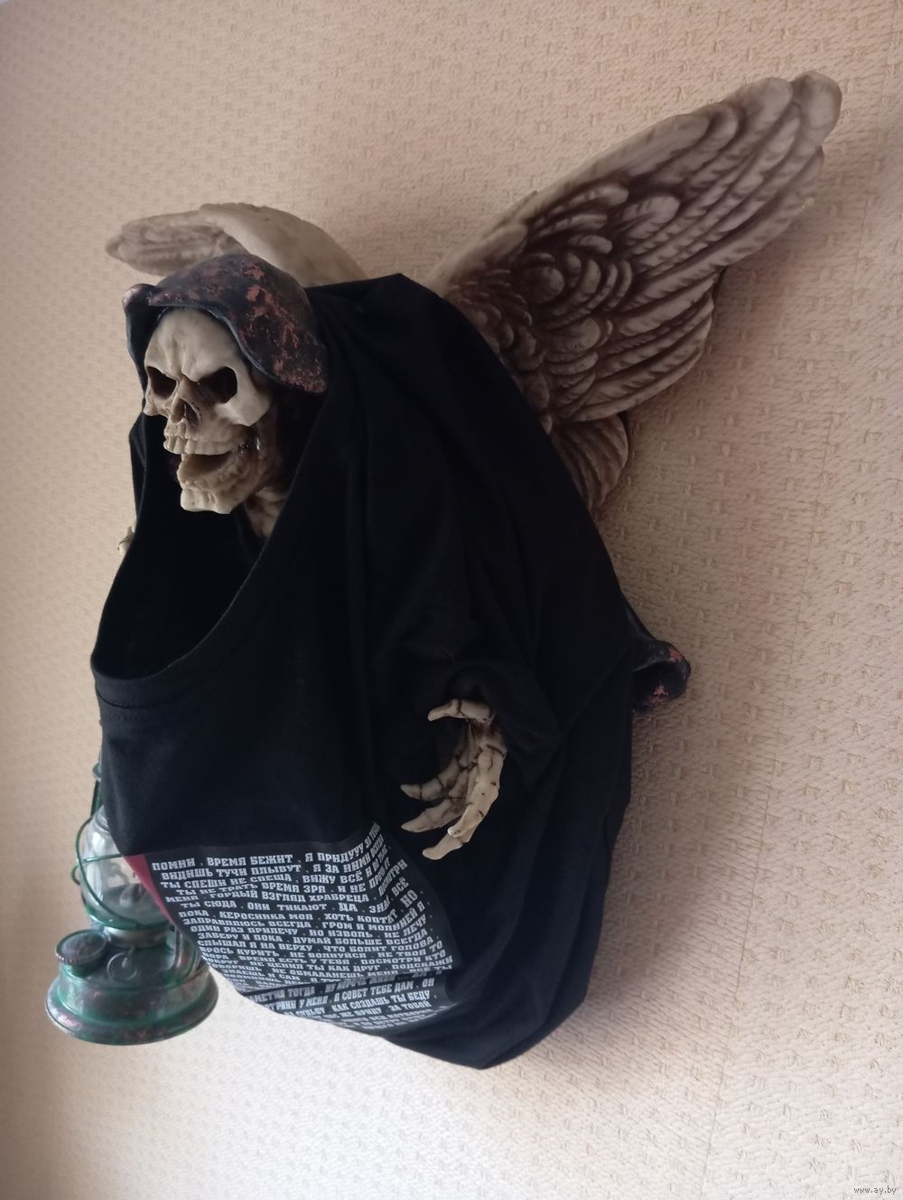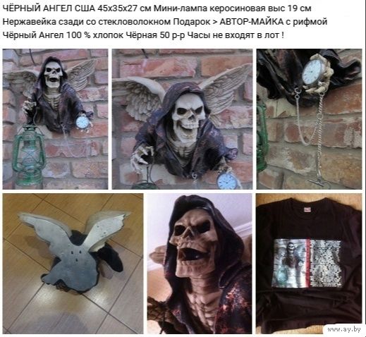 Бюст АНГЕЛ ЧЁРНЫЙ , лампа мини-керосиновая , всё производство США , 45х35х27 см. , искусственный камень смола , нержавейка сзади со стекловолокном . Редкая лампа-мини керосиновая настоящая , выс - 19 см без учёта высоты ручки . P.S. - Часы с цепью не входят в лот и не продаются , левая кисть незаметно приклеена в запястье + АВТОР-МАЙКА по теме с Автографом поэта на принте майки , новая , 50 р-р , 100 % хлопок , чёрная . Всё Белпочтой или самовывоз .