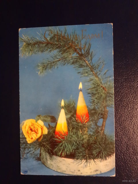 С Новым Годом! 1970 г. Свечи, роза. подписанная.