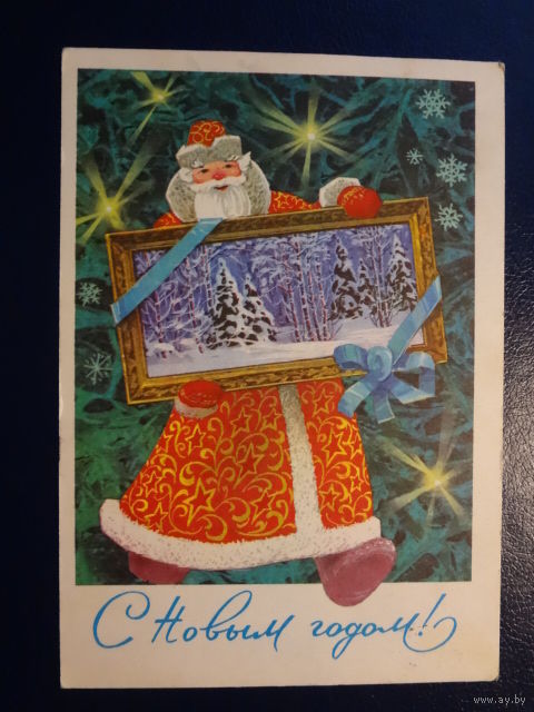 С Новым годом! 1974 г. Дед Мороз с картиной. подписанная.