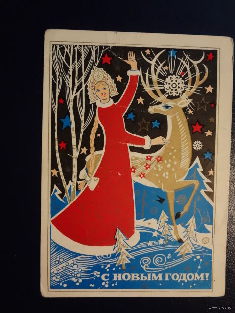 С Новым годом! 1974 г. Снегурочка, олень. подписанная.