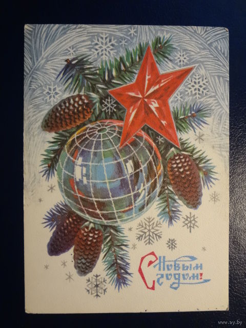 С Новым годом! 1974 г. Земной шар, звезда, шишки. подписанная.
