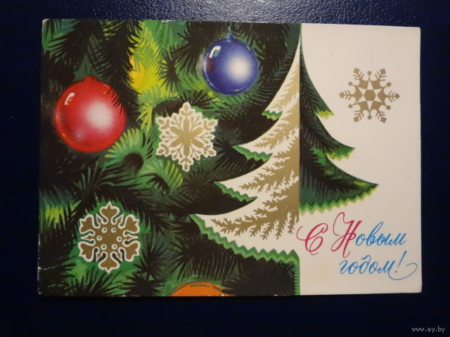 С Новым годом! 1975 г. Ель, шары, снежинки. подписанная.