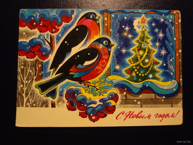 С Новым годом! 1975 г. Снегири, рябина, окно. подписанная.