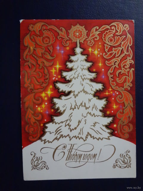 С Новым годом! 1976 г. Ель в снегу, огни. подписанная.