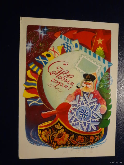 С Новым годом! 1977 г. Дед Мороз за штурвалом, сигнальные флаги. подписанная.