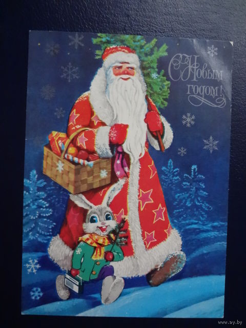 С Новым годом! 1978 г. Дед Мороз, корзинка, зайчик. подписанная.