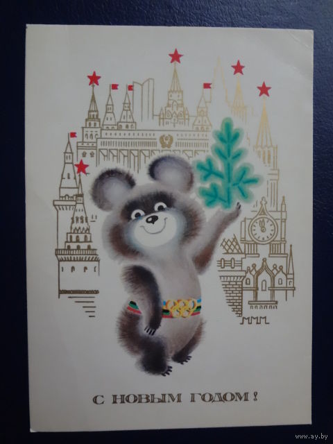 С Новым годом! 1978 г. Олимпийский Мишка, башни Кремля. подписанная.