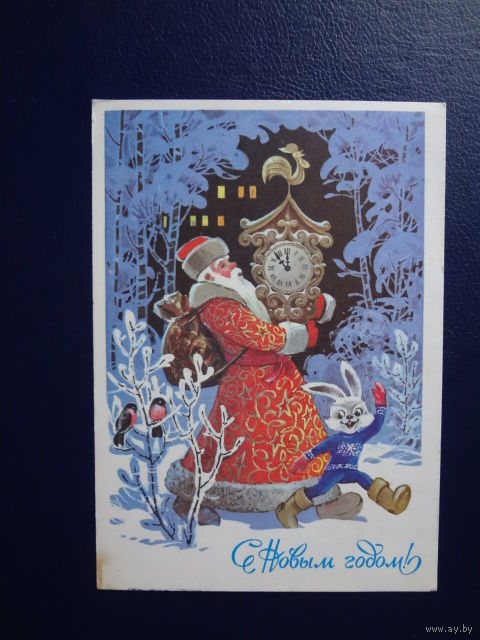 С Новым годом! 1979 г. Дед Мороз, с часами и рюкзаком, зайчик. подписанная.
