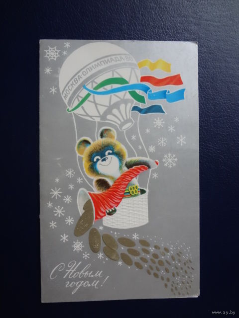 С Новым годом! 1979 г. Олимпийский Мишка в гондоле воздушного шара с рогом изобилия. двойная. чистая.