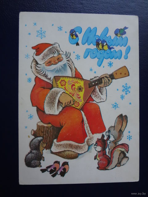 С Новым годом! 1980 г. Дед Мороз - балалаечник, звери, птицы. подписанная.