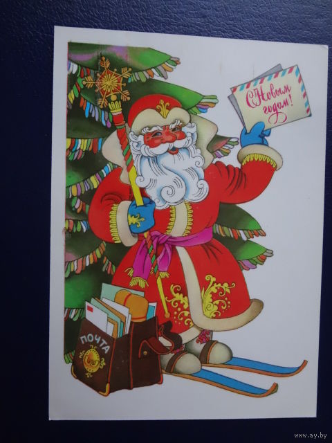 С Новым годом! 1980 г. Дед Мороз на лыжах, сумка почтальона. подписанная.