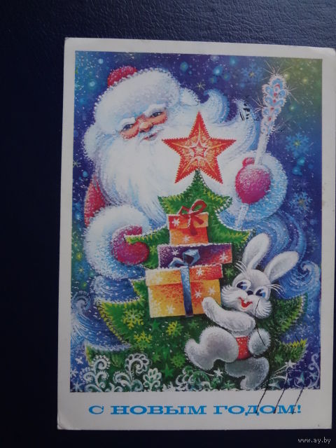 С Новым годом! 1980 г. Дед Мороз, зайчик, подарки. подписанная.