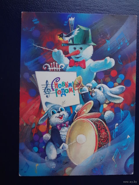 С Новым годом! 1980 г. Оркестр: Снеговик, зайцы. подписанная.