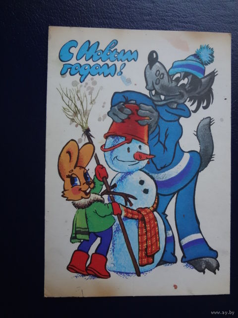 С Новым годом! 1980 г. Снеговик, волк, заяц. подписанная.