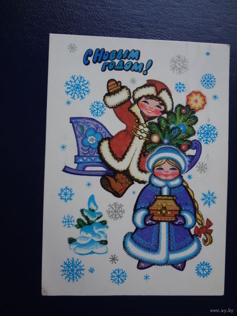С Новым годом! 1980 г. Снегурочка, ларец, Мальчик Новый год, сани. подписанная.