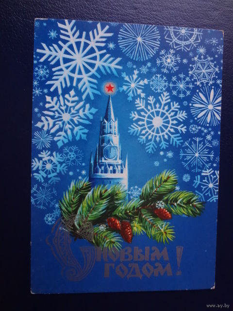 С Новым годом! 1980 г. Спасская башня Кремля, снежинки. подписанная.