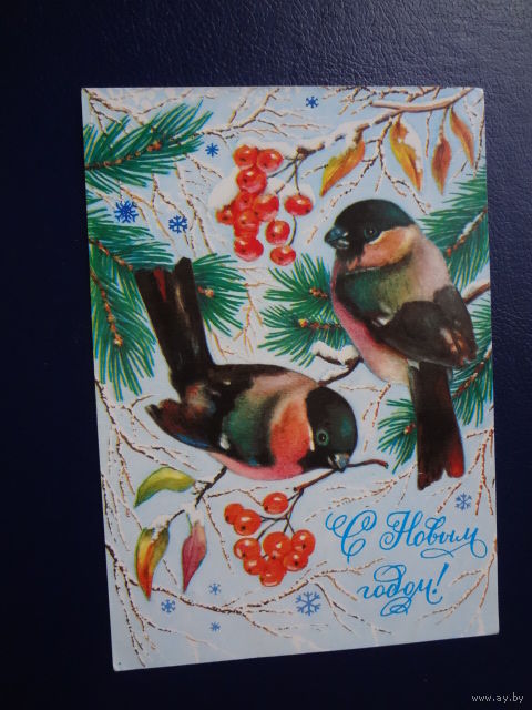 С Новым годом! 1981 г. Снегири, рябина. подписанная.